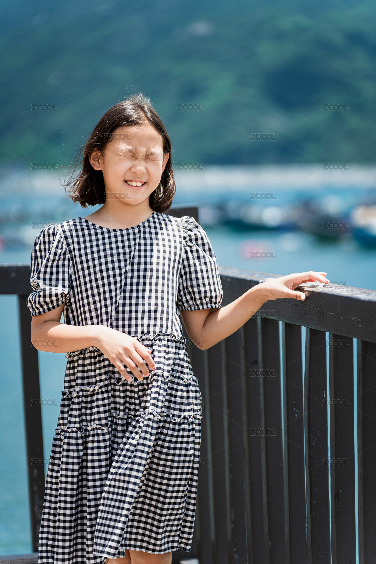 穿着青色短裙的女孩挎着包包俏皮微笑