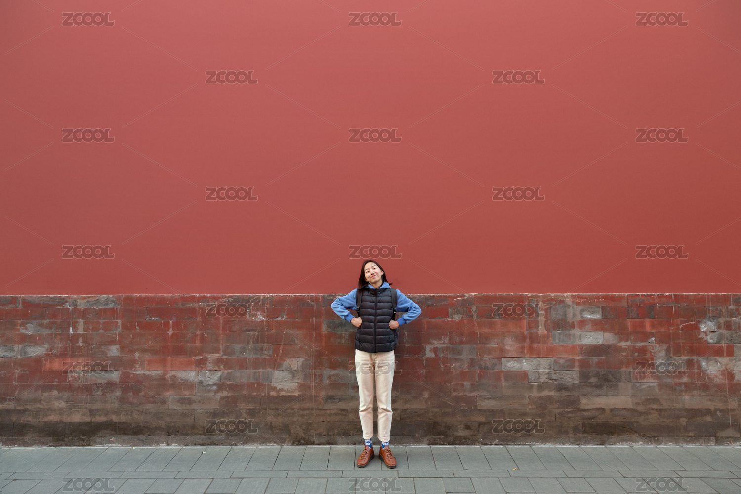 一位可爱的女生站在故宫宫内红墙下双手叉腰俏皮可爱