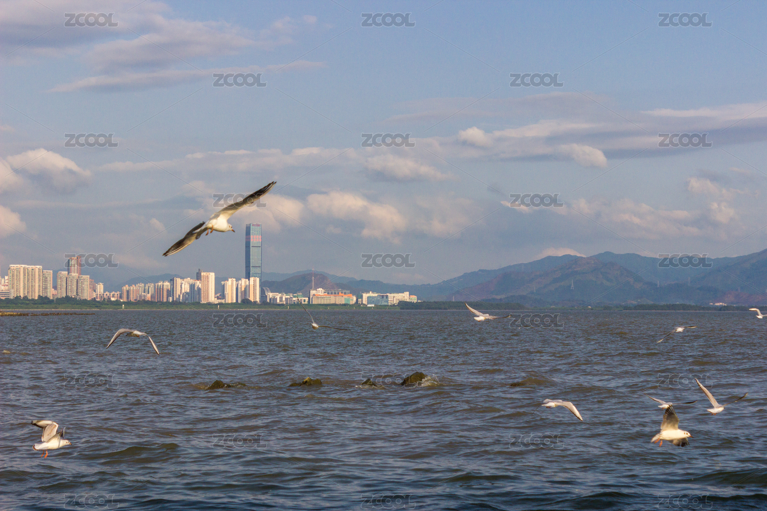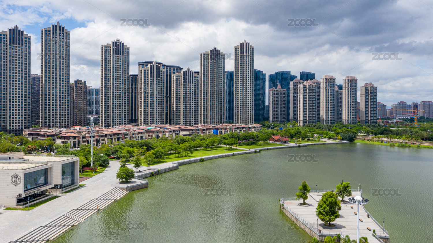 宁波日湖的湖畔步道平静的湖面高楼与绿树