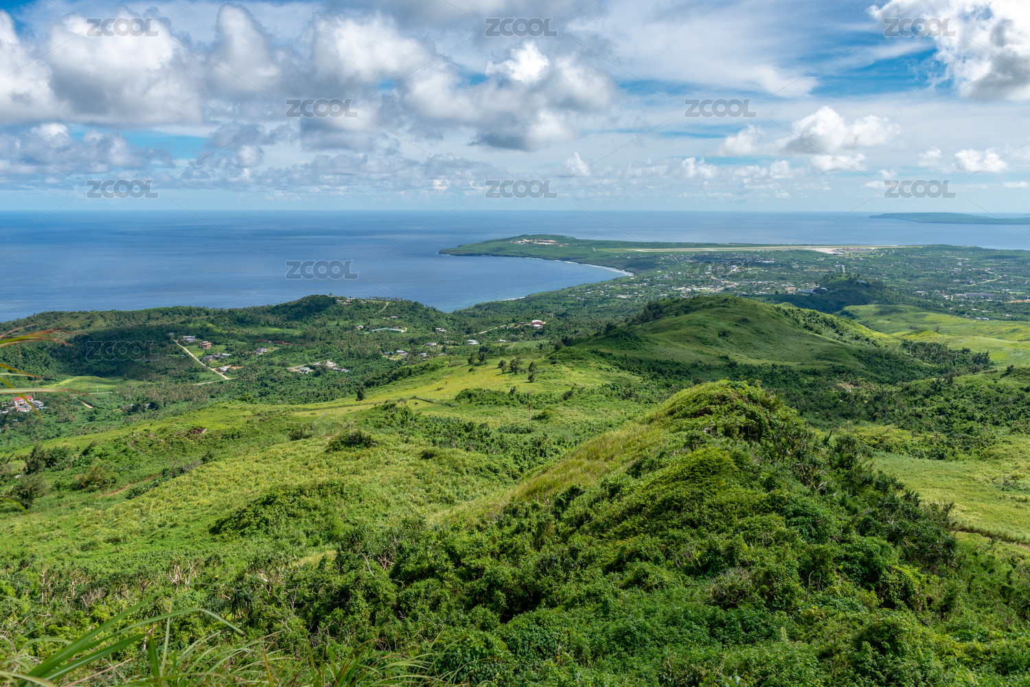秋季白天美国塞班岛最高峰俯拍海岸线风光