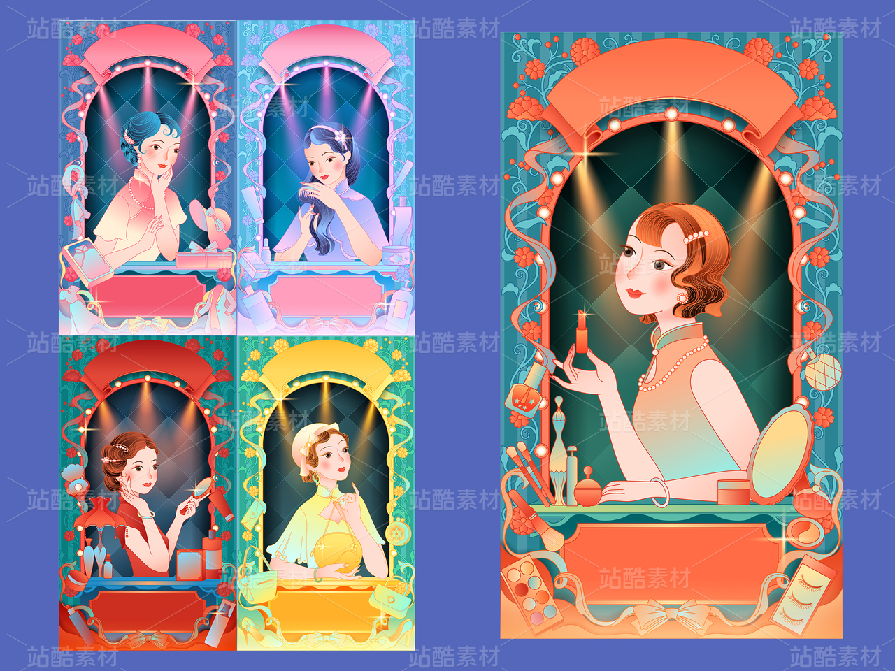 国潮电商民国服饰美女美妆商品直播促销矢量插画