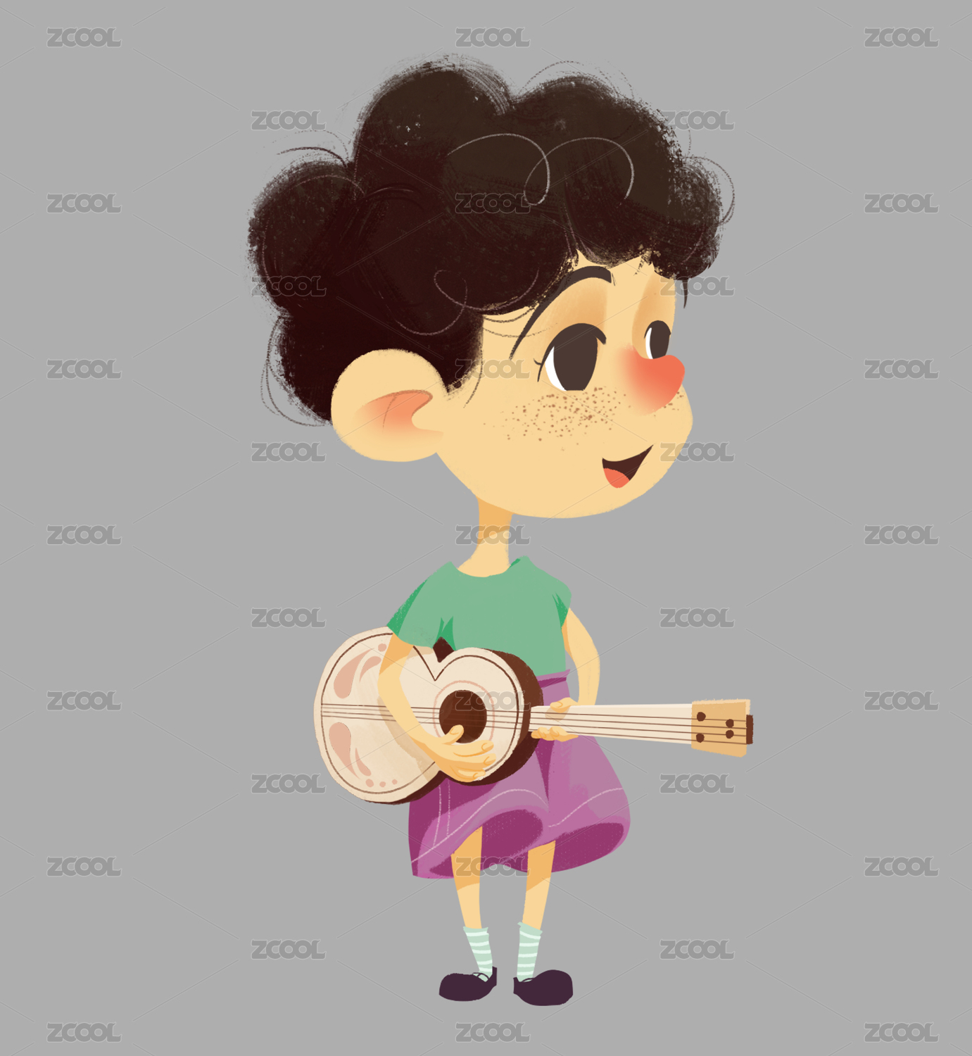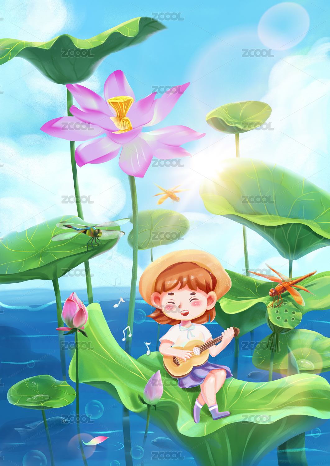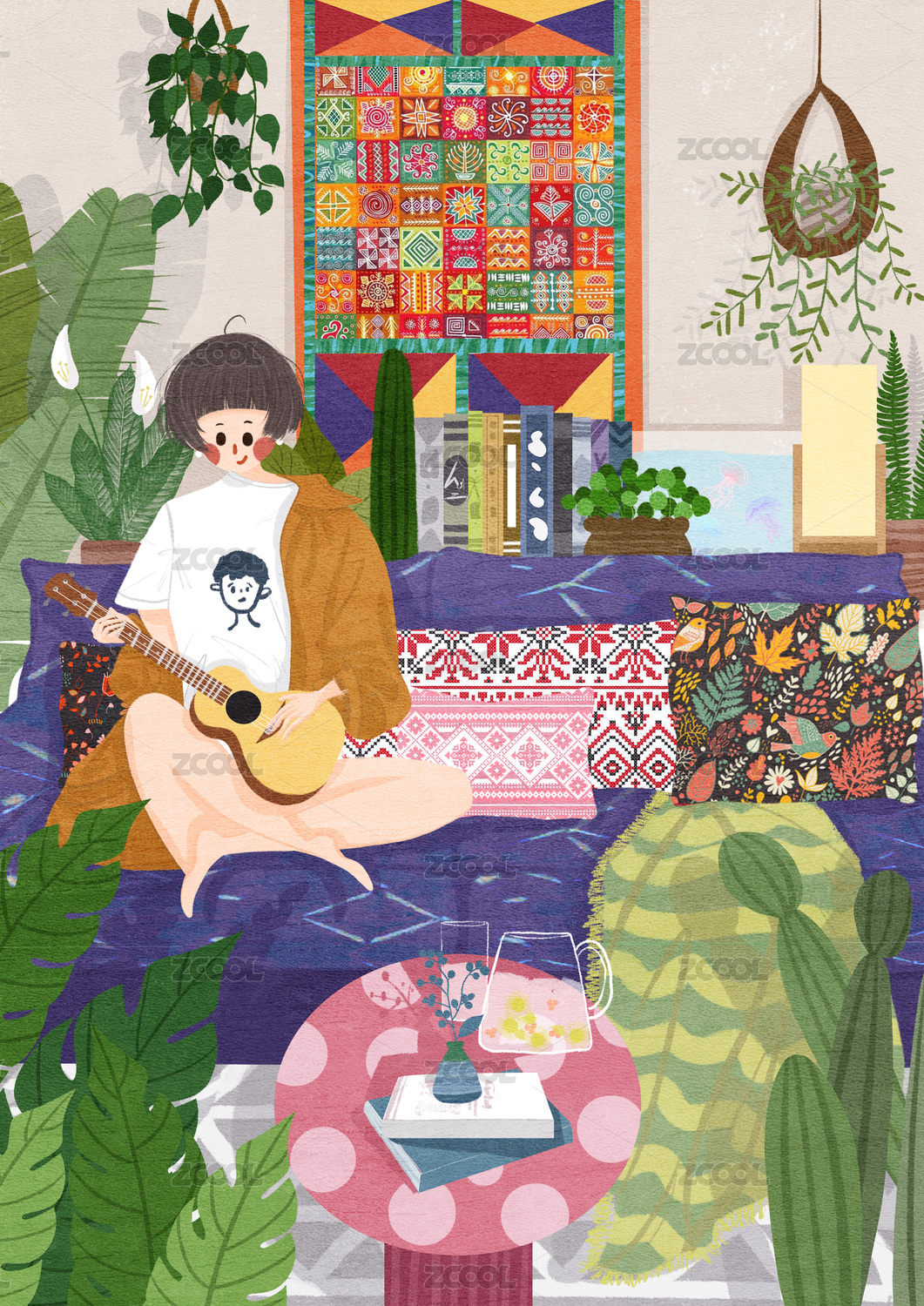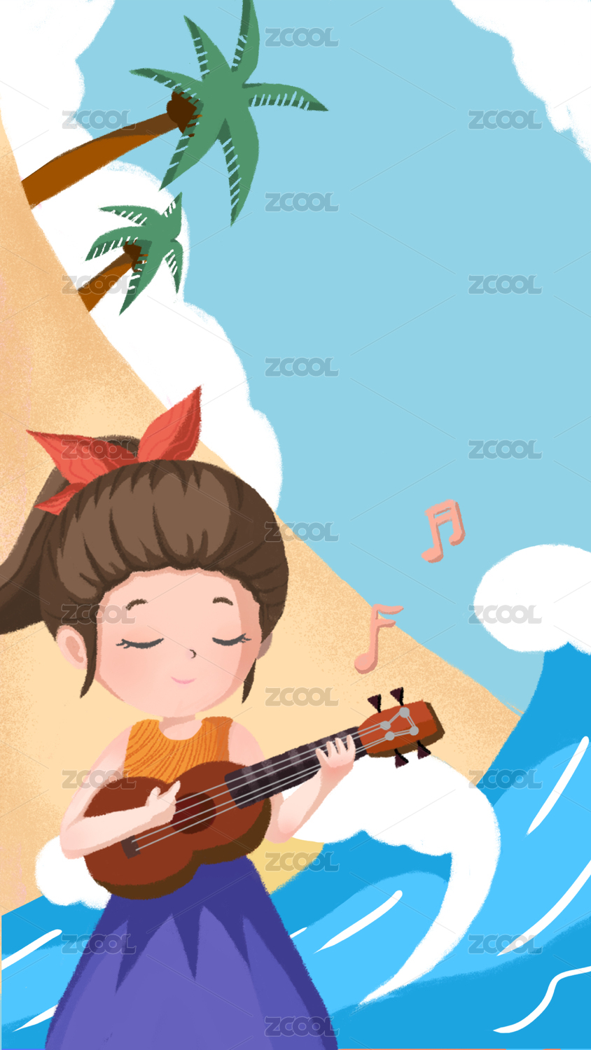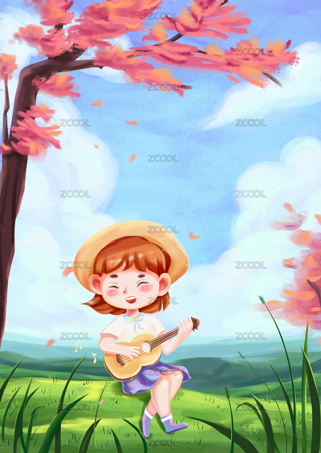 微景园林假山芭蕉树下弹琴老人工笔矢量插画