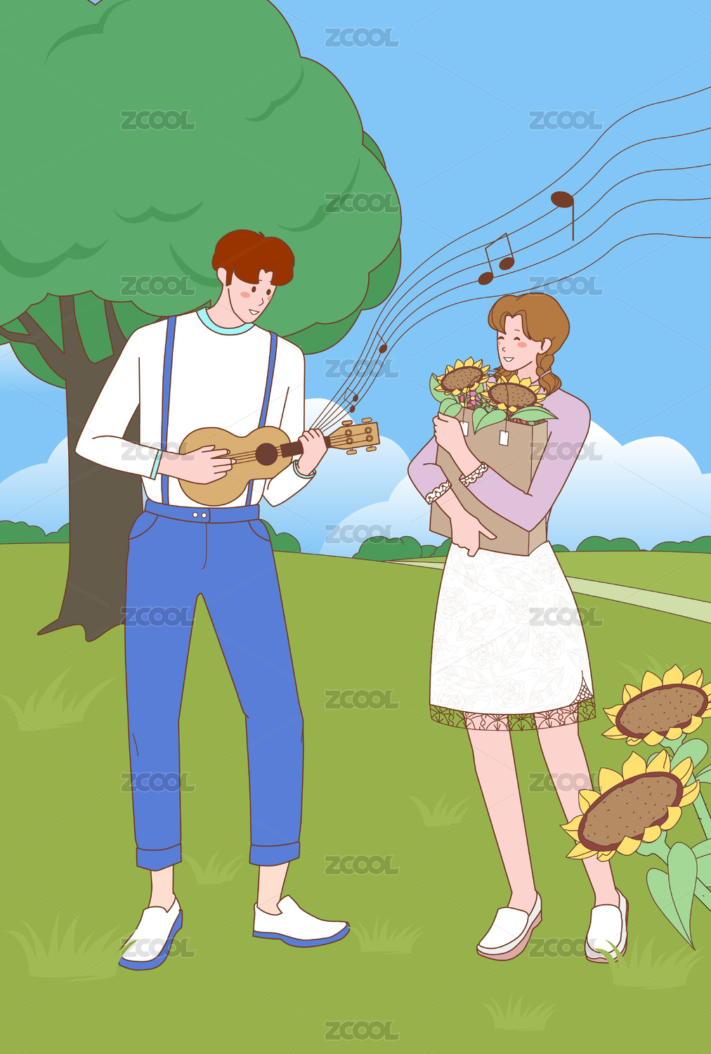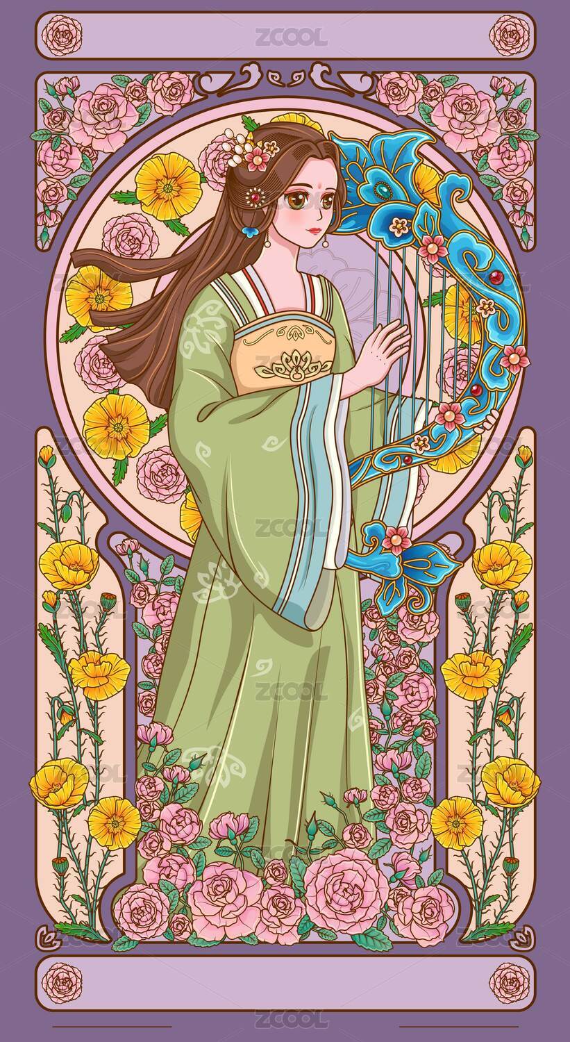 古风重阳老人菊花弹琴古人雅趣工笔矢量插画