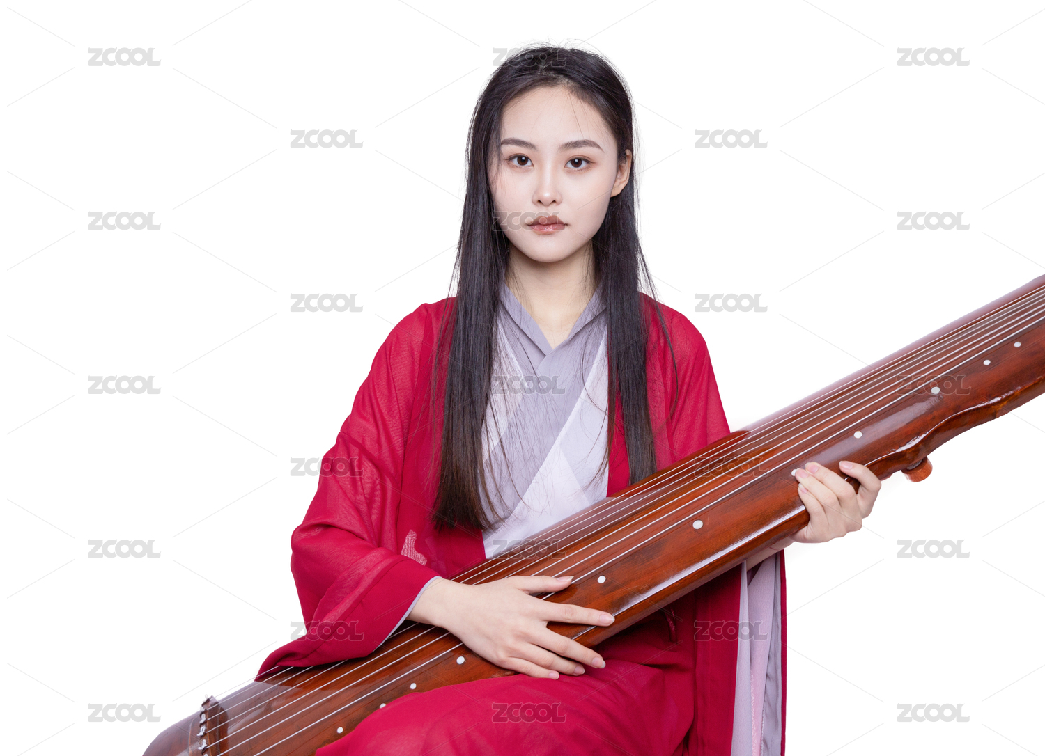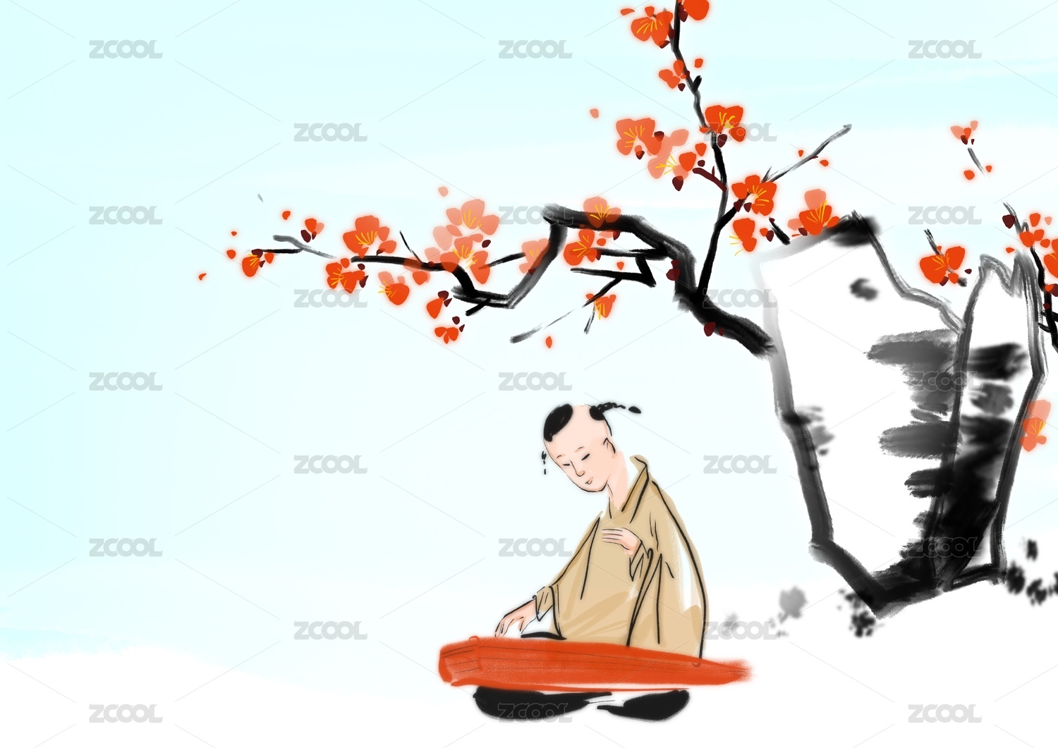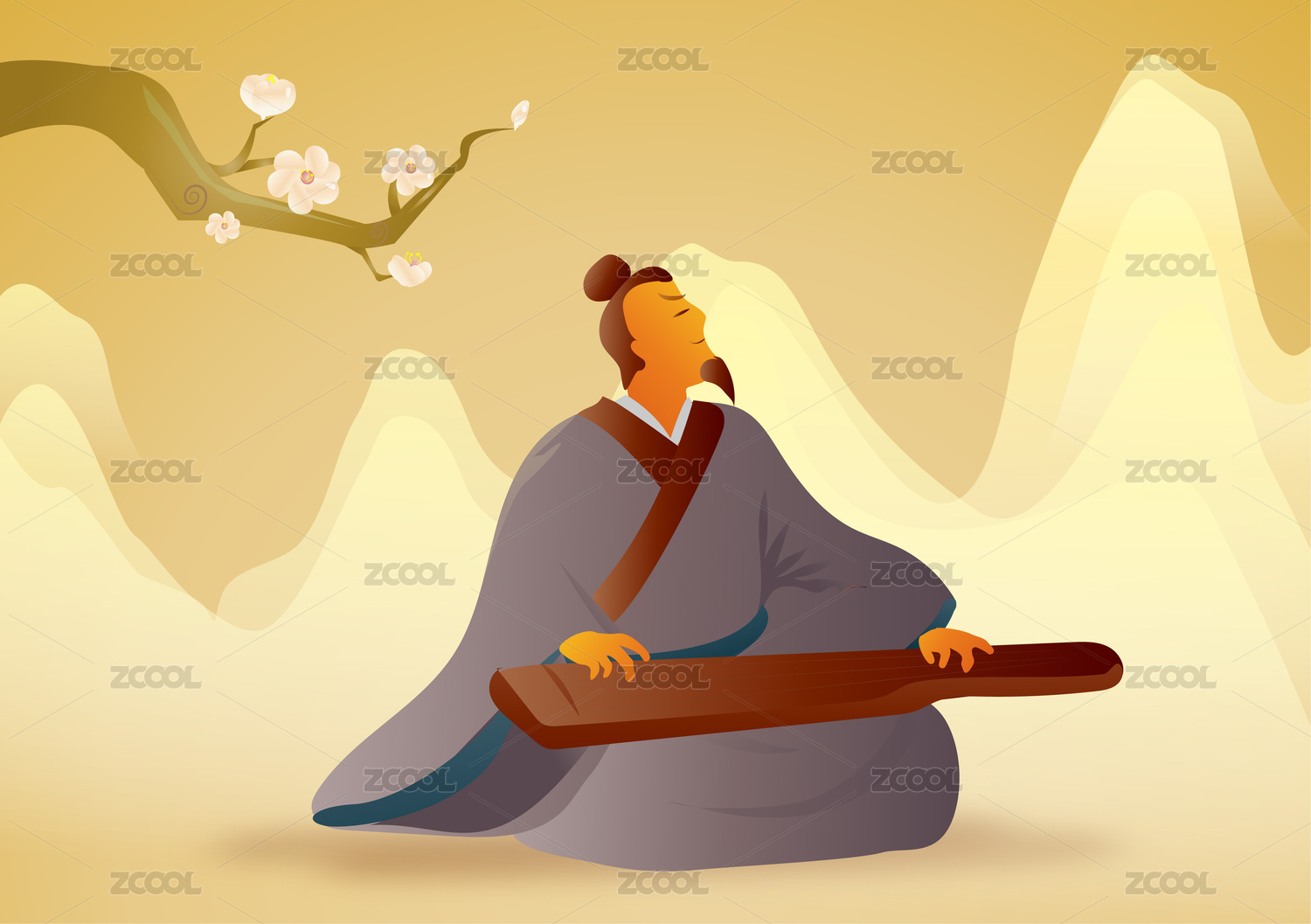 园林假山亭子松树弹琴中国风矢量手绘插画