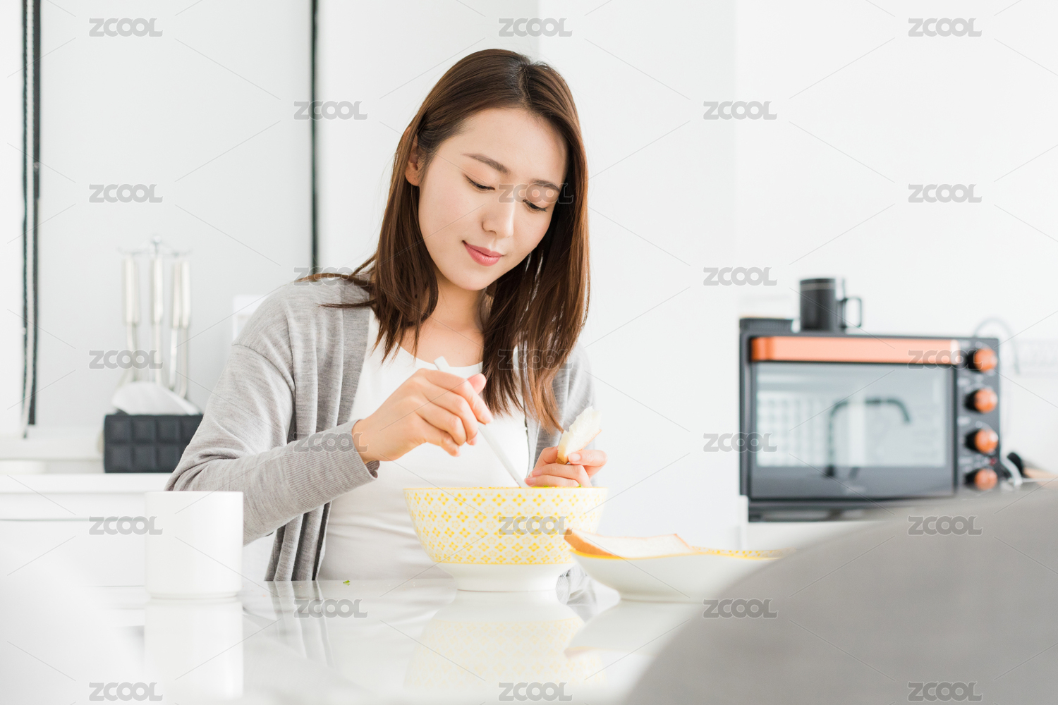 年轻女性早晨在家吃早餐健康生活