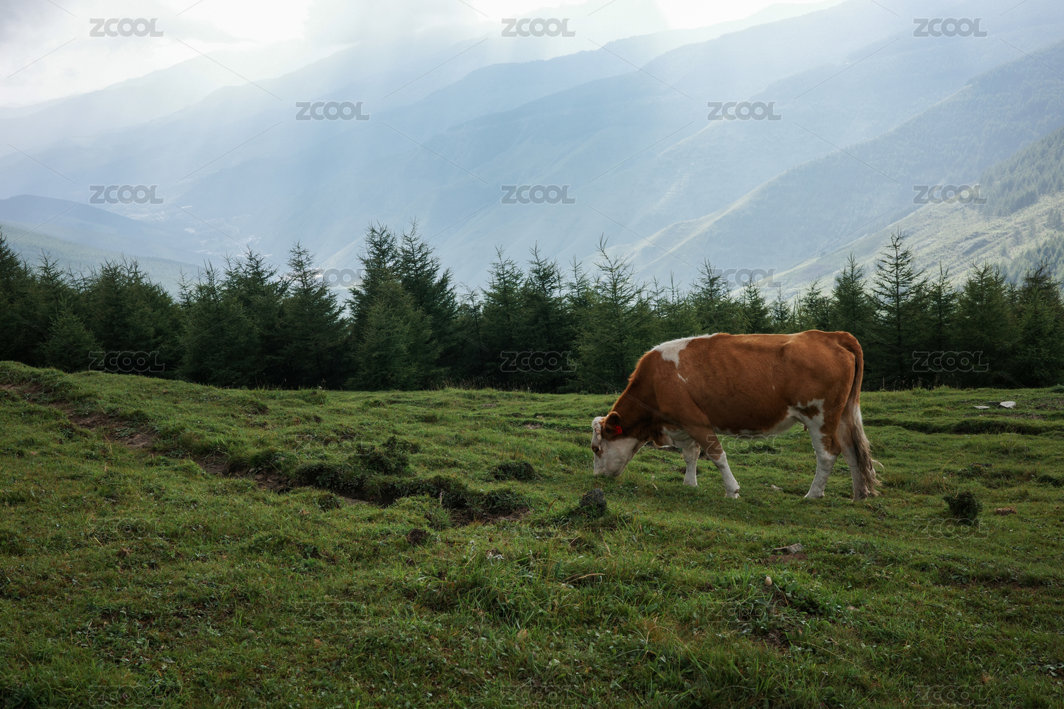 山西忻州山地草原:云雾缭绕中牧牛的山野自