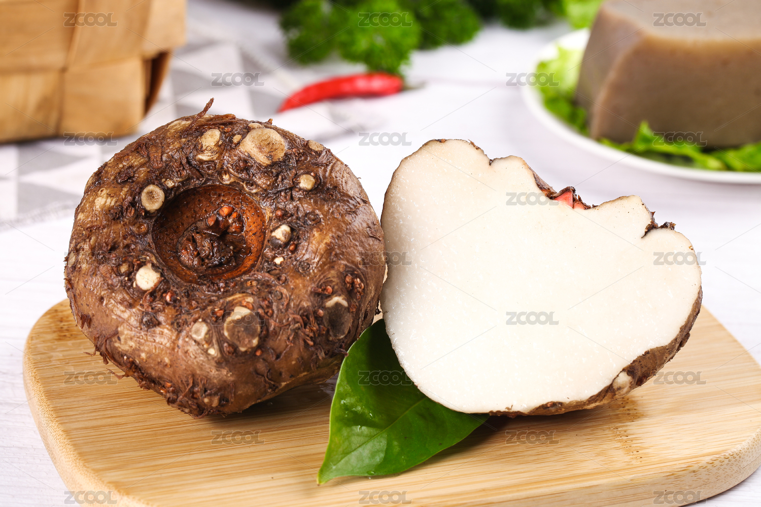 木板上放着一个完整的山地鲜魔芋和半边魔芋
