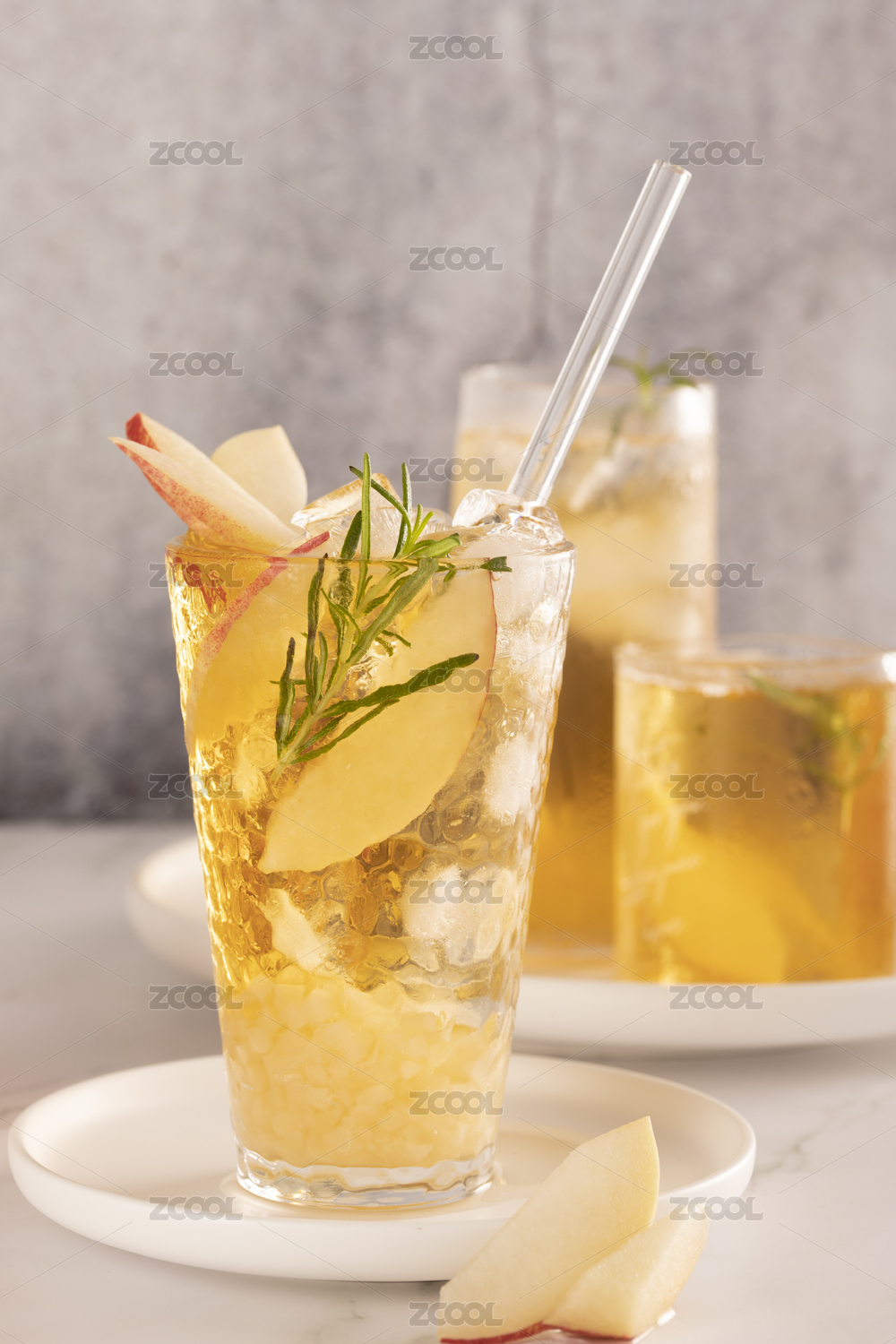桌面上的杯子里的美味可口的蜜桃乌龙茶