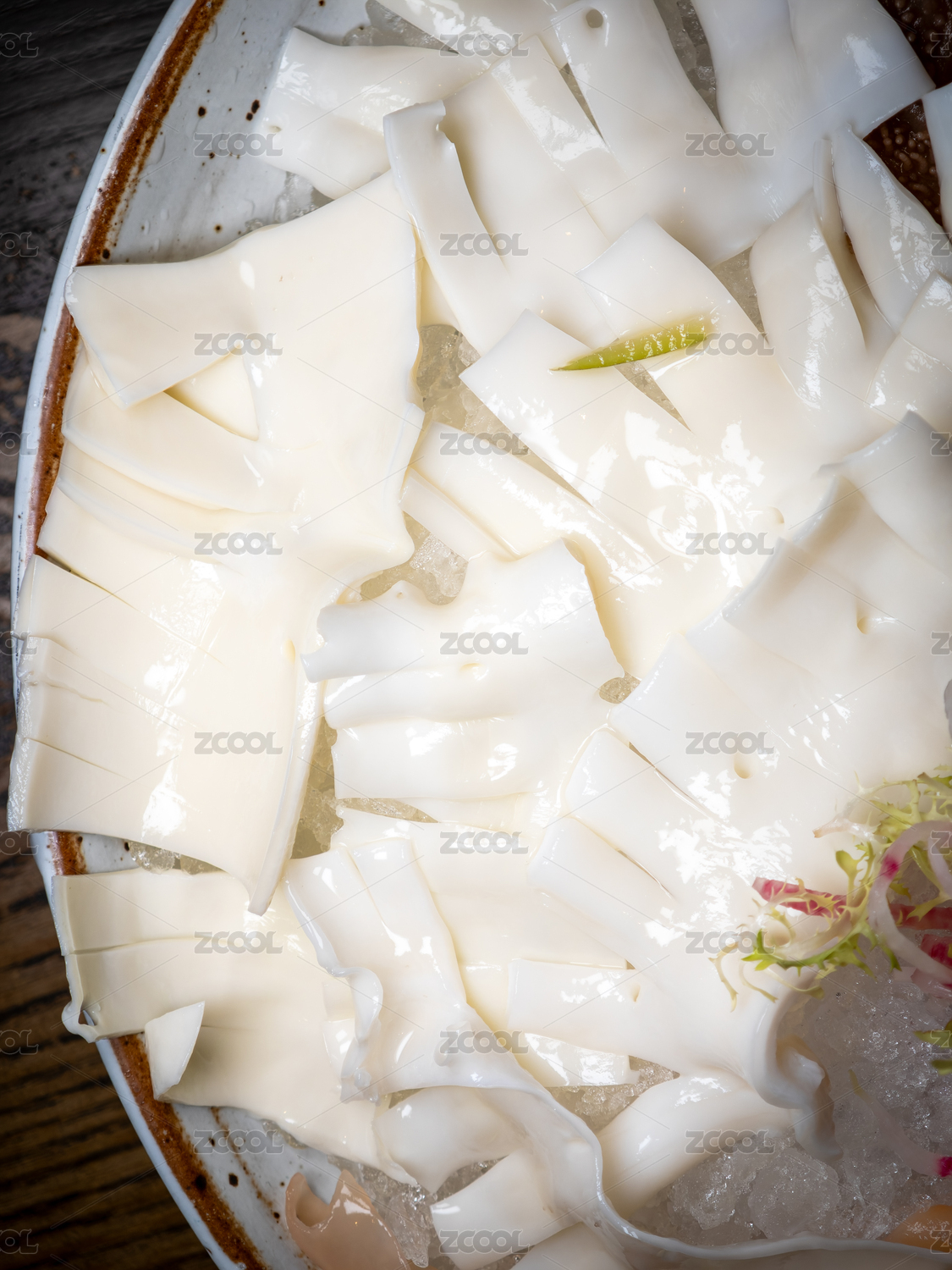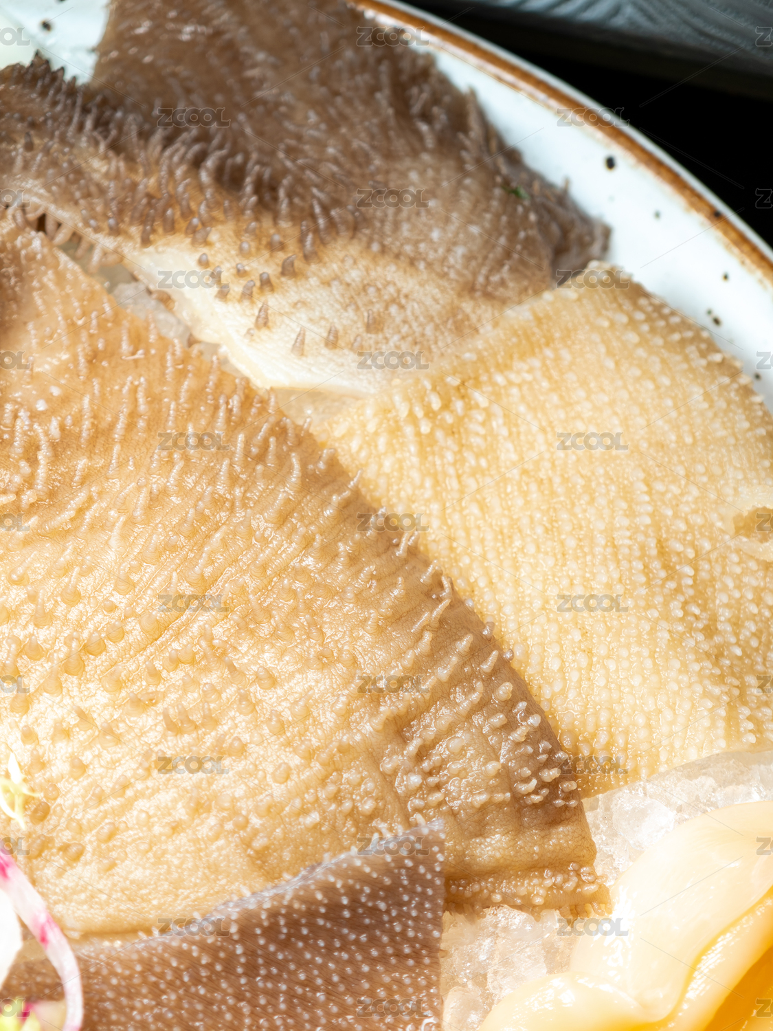 一盘放在白色背景上的食材鸭肠
