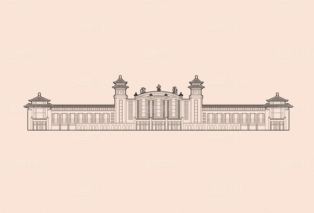 北京地标建筑北京站线稿插画北京火车站线稿PNG透底图