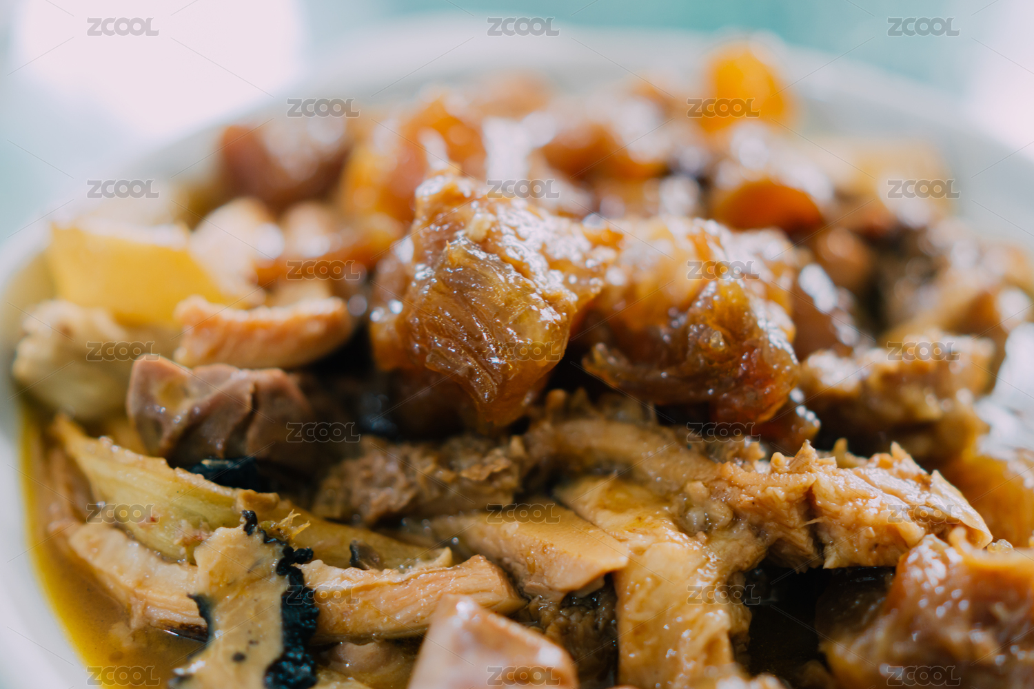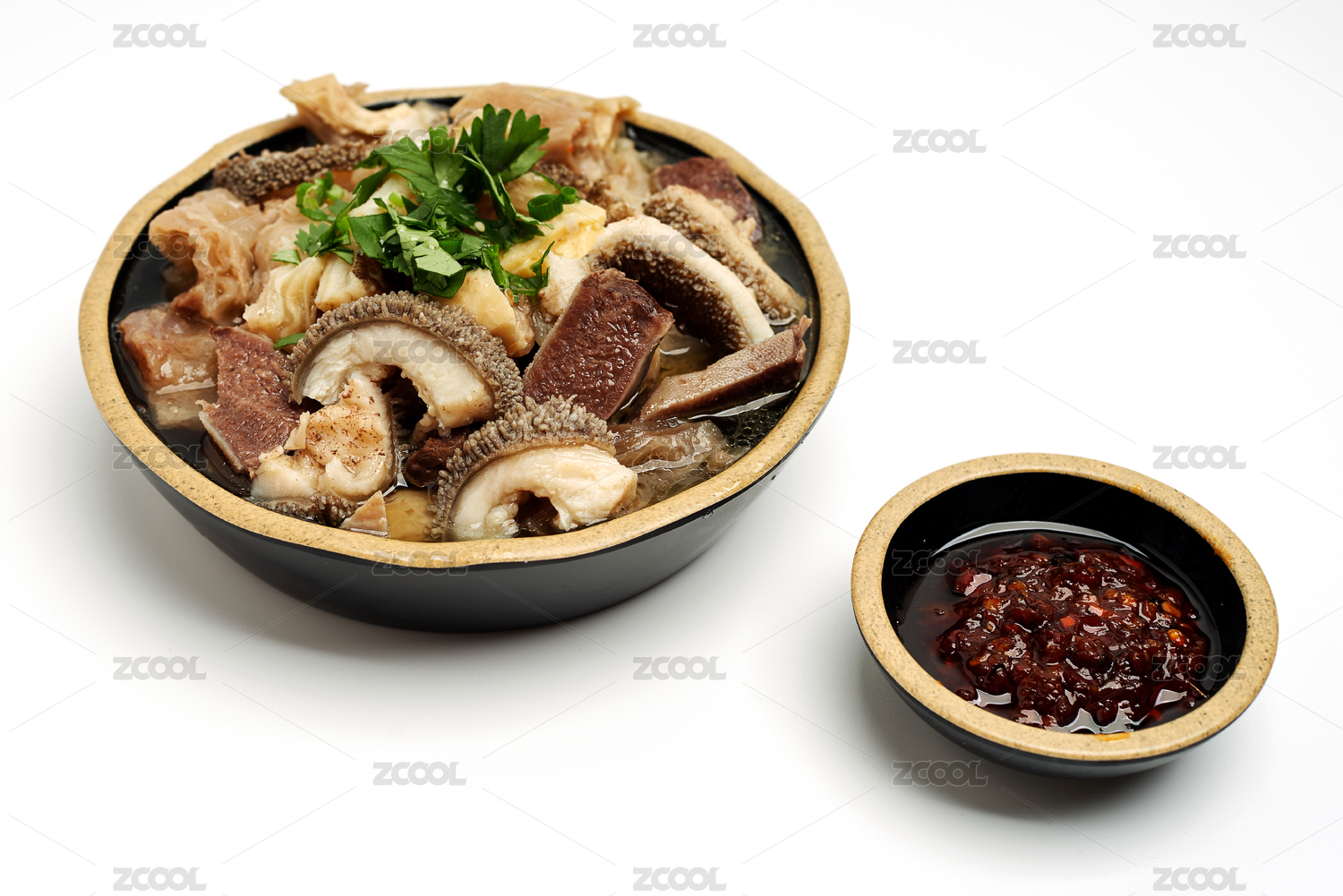 放在白色桌面上的中国广东风味美食——一碟牛杂配酱料