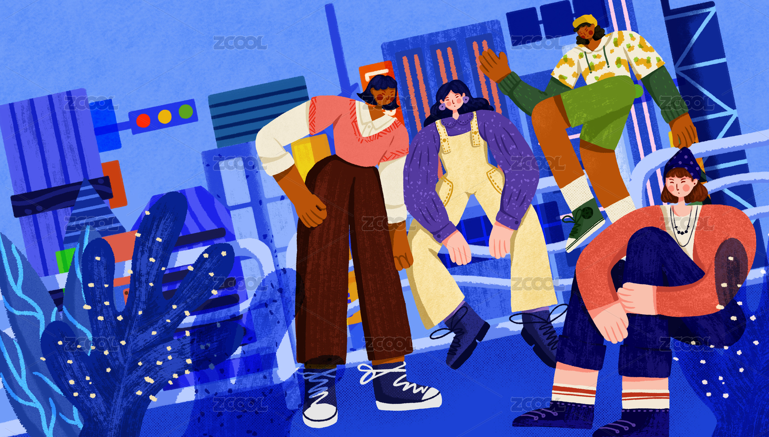 秋冬潮流人物时尚出游城市扁平噪点插画