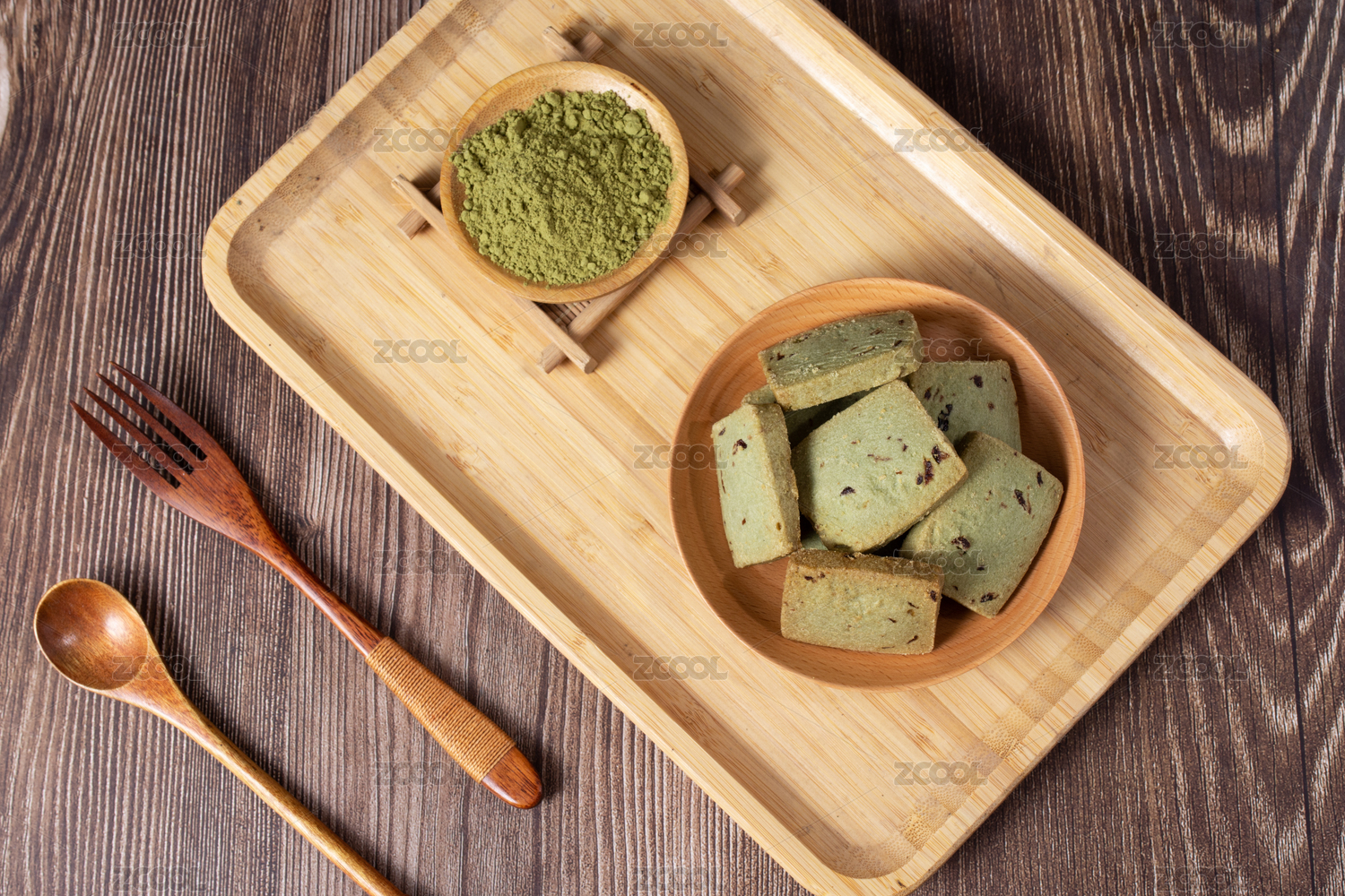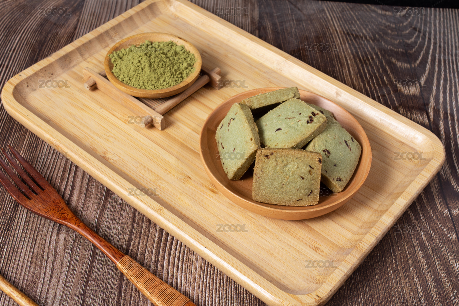 木纹桌面上的木盘子里的抹茶饼干