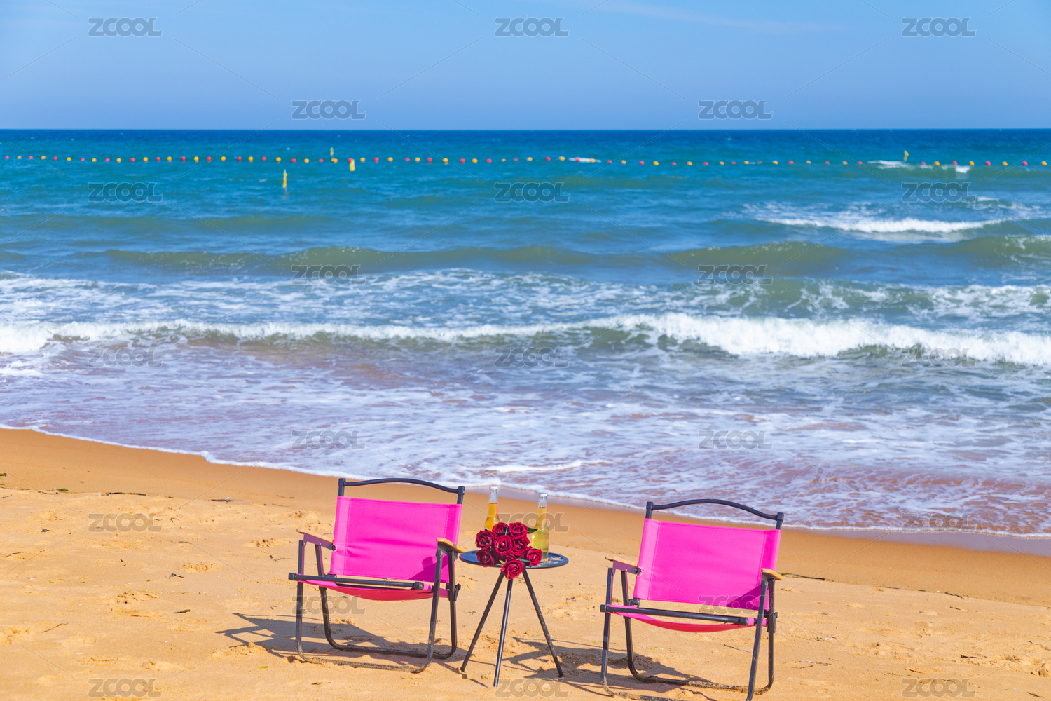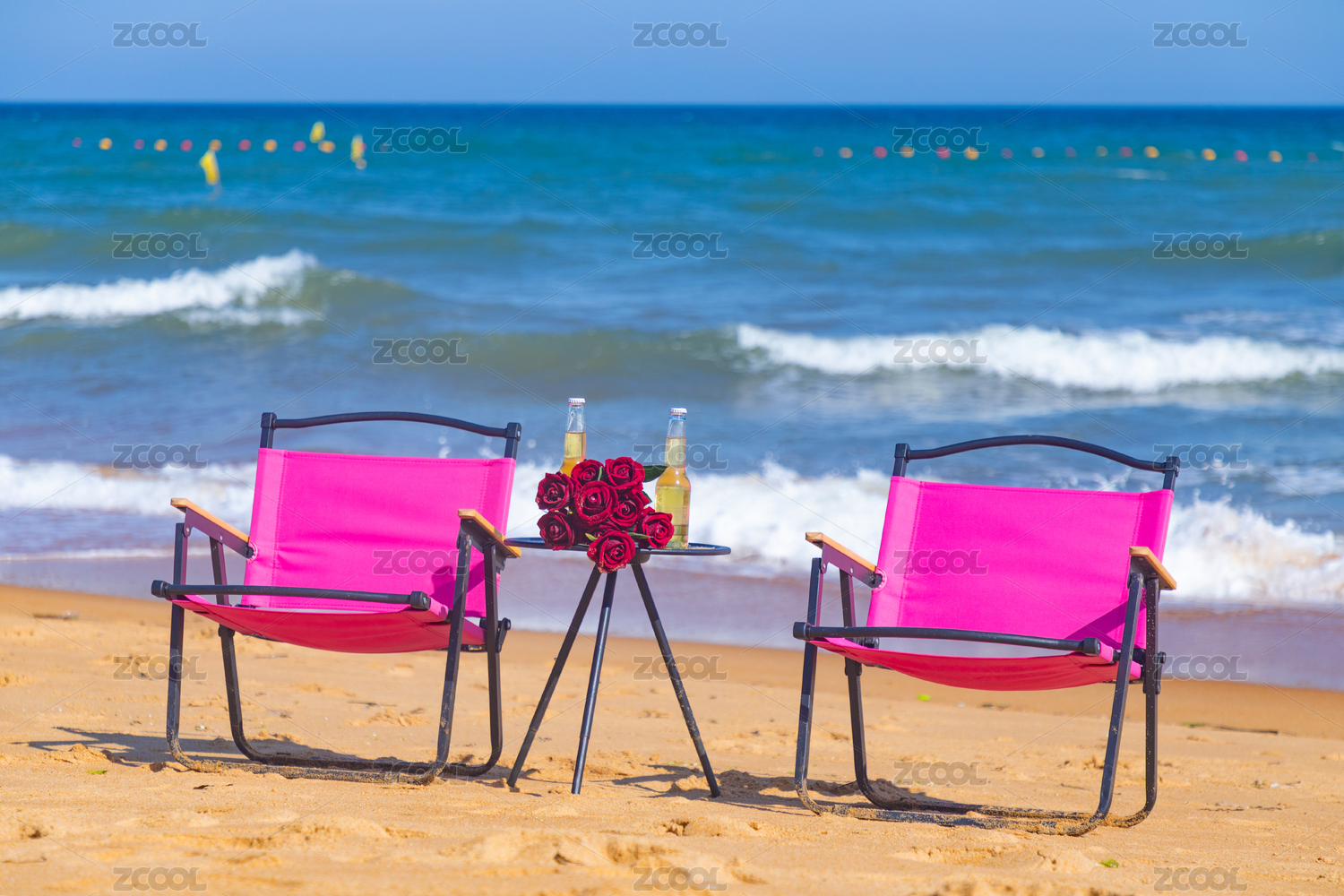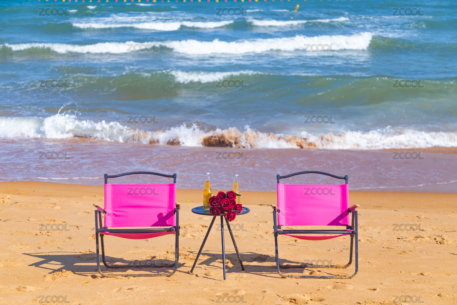 海边沙滩上的粉红色椅子和圆桌上的玫瑰和啤