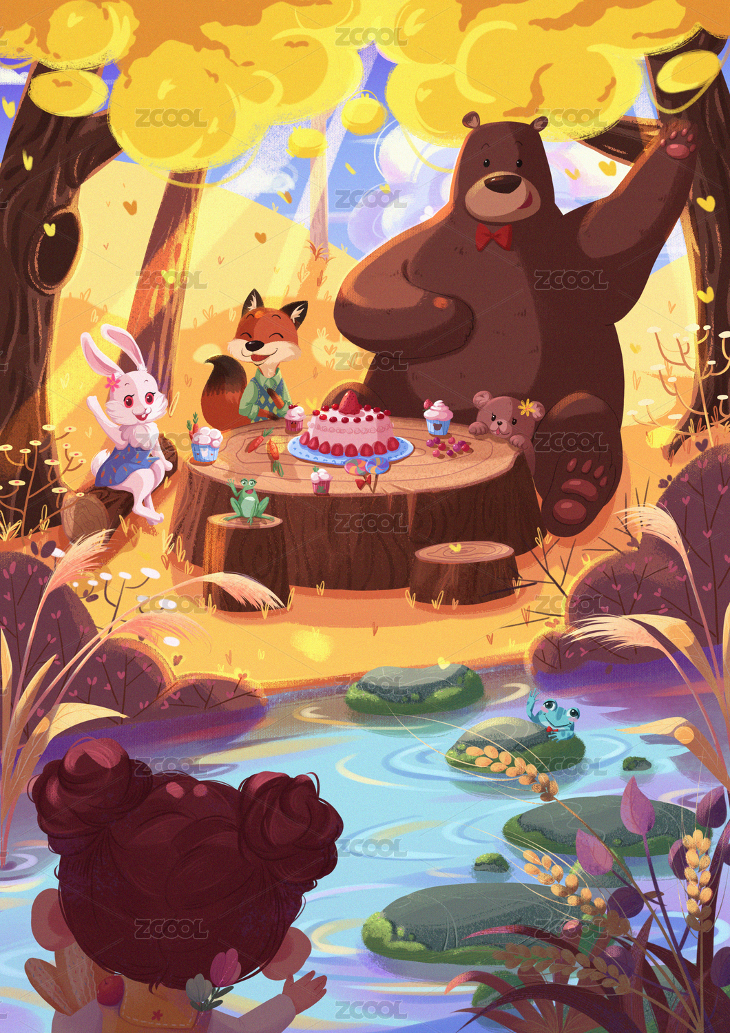 秋天小动物们在树下聚餐呼喊迟到的女孩