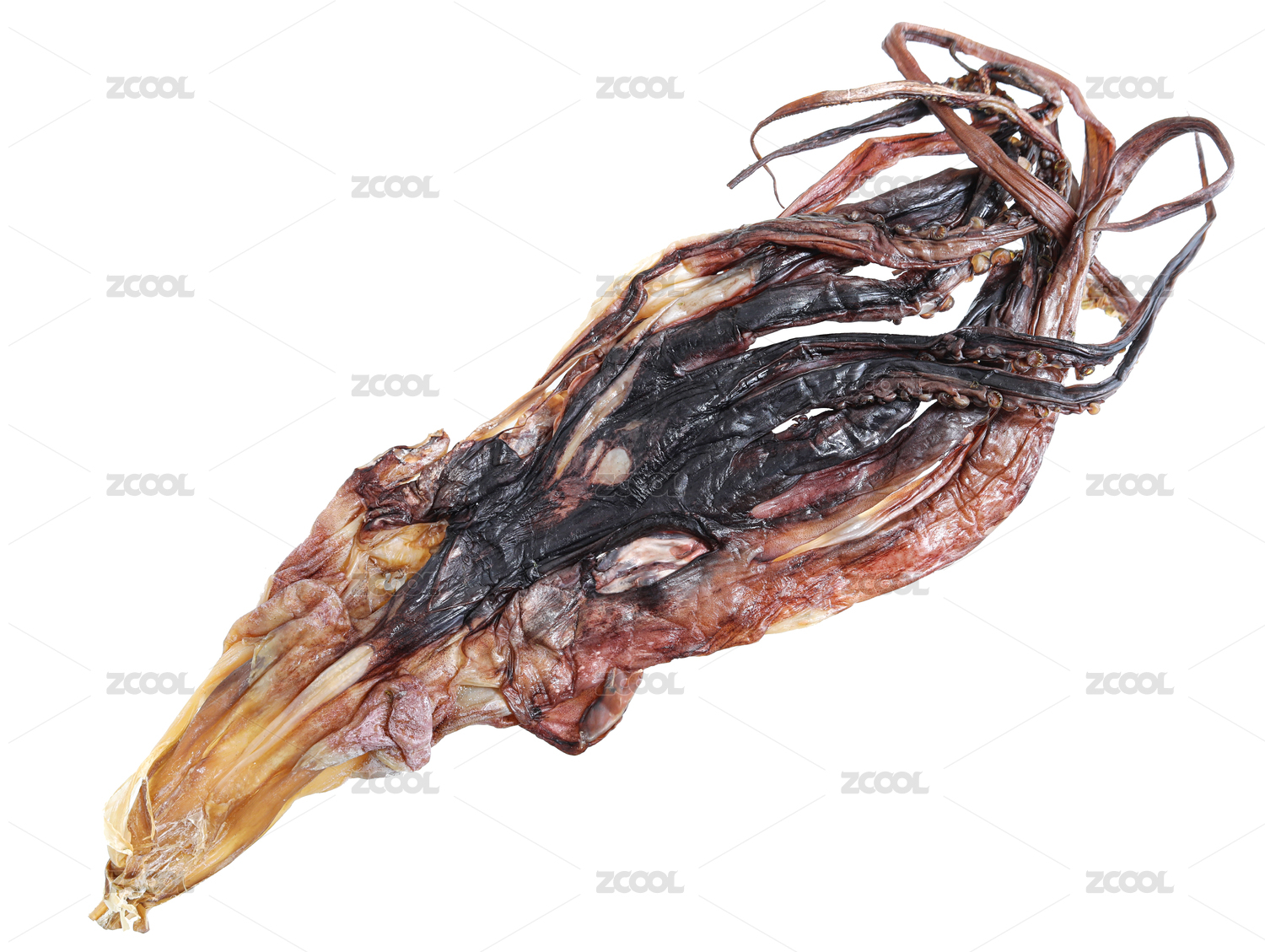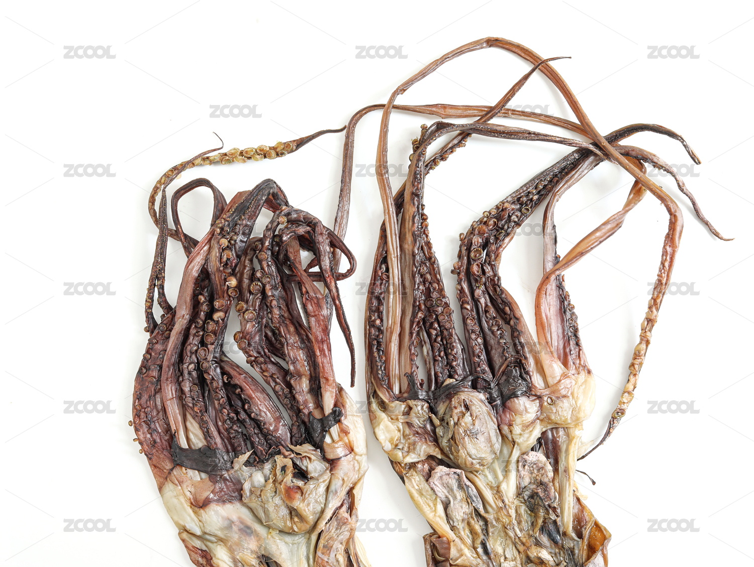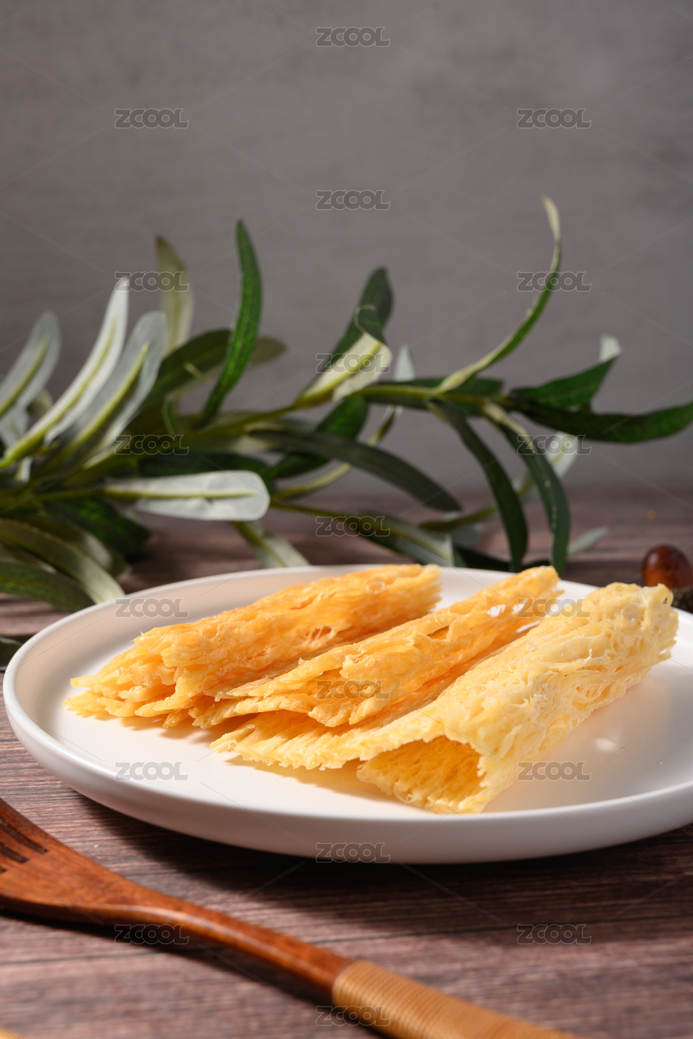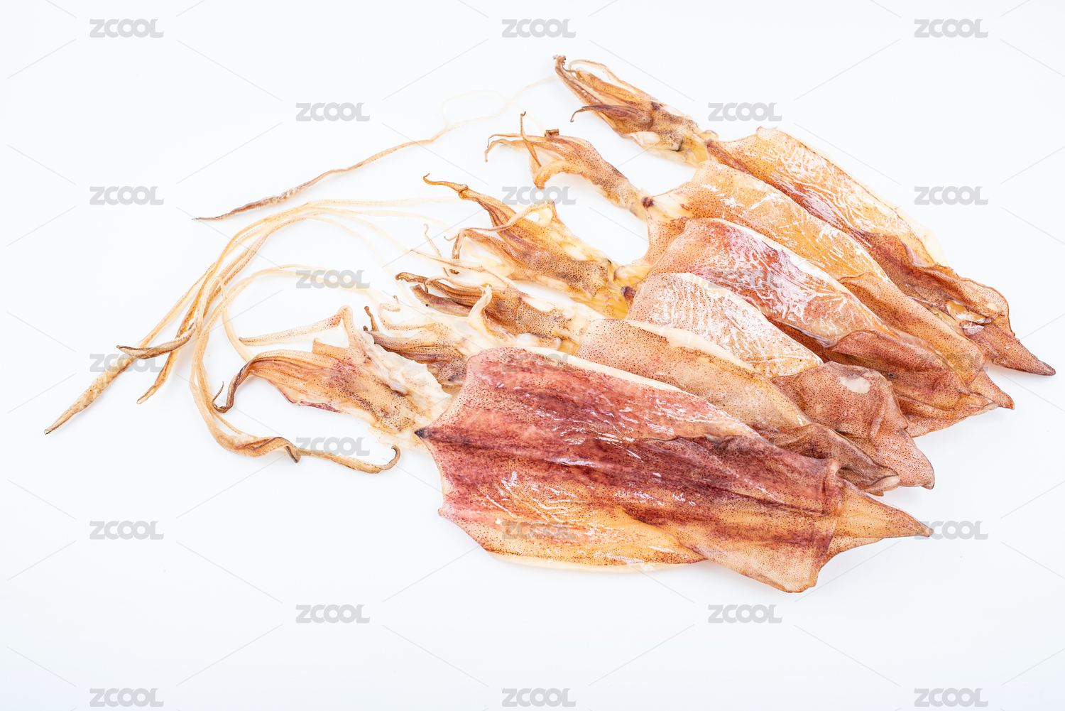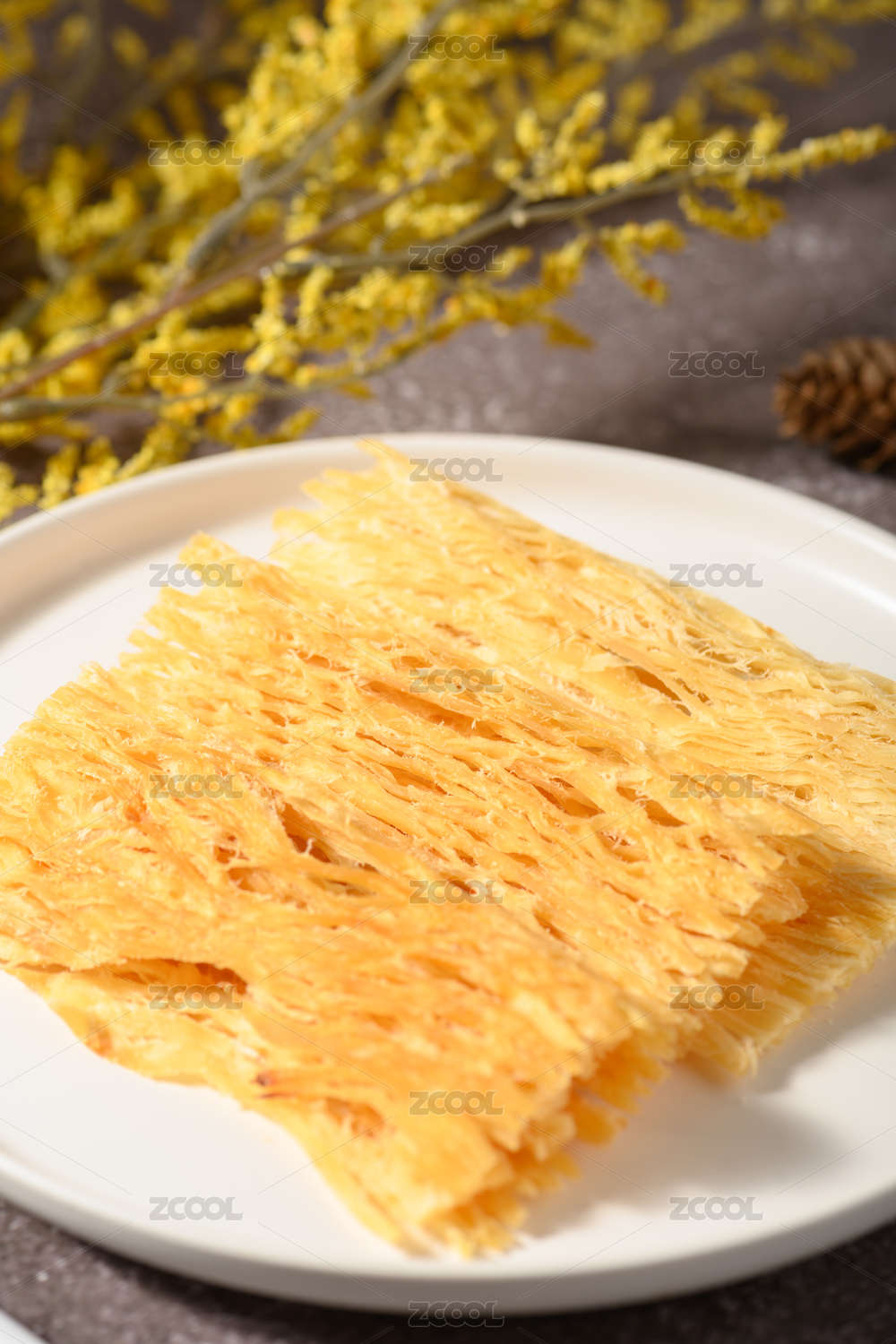 桌面上的白色陶瓷盘子里的风琴鱿鱼干