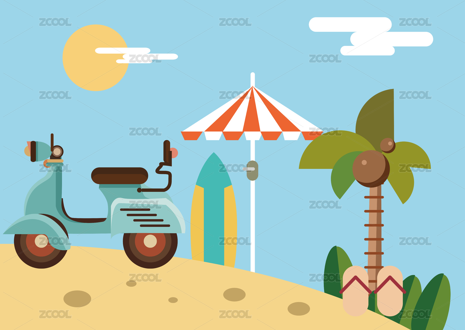 夏日清凉沙滩单车旅游插画