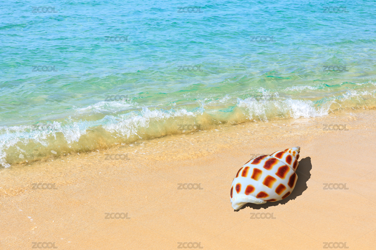 夏季海边沙滩上的海螺和水面背景