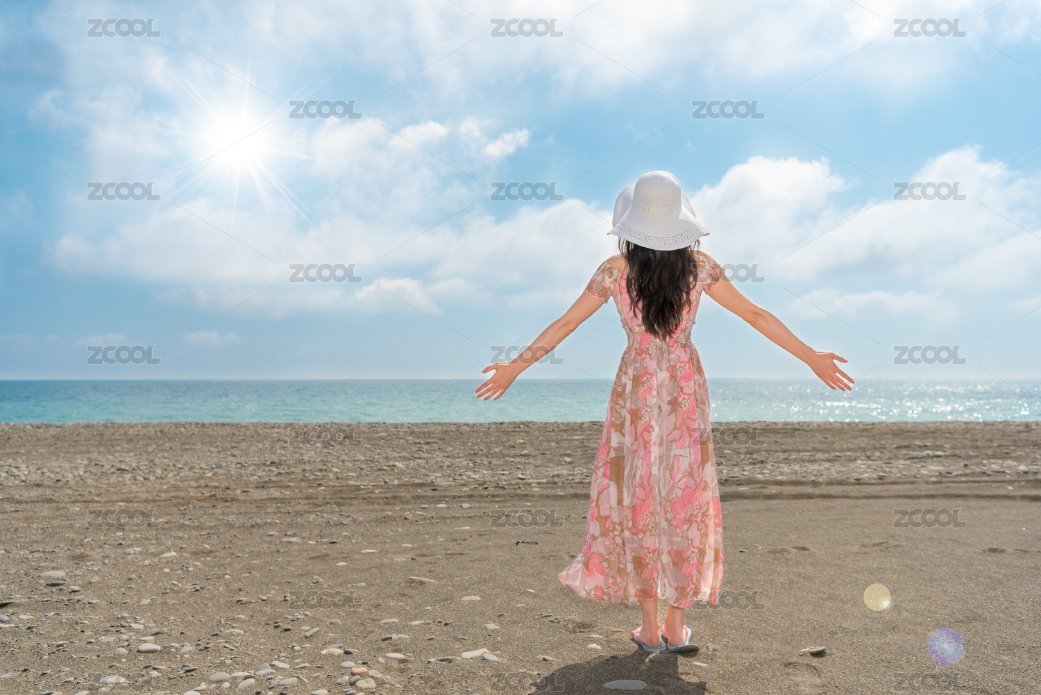 优雅的女人穿着漂亮的衣服和海沙滩帽站立和手臂打开享受从阳光的度假旅行海洋微风回来查看过COPYSPACE。