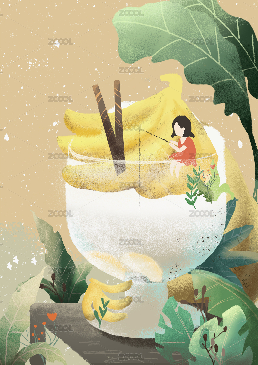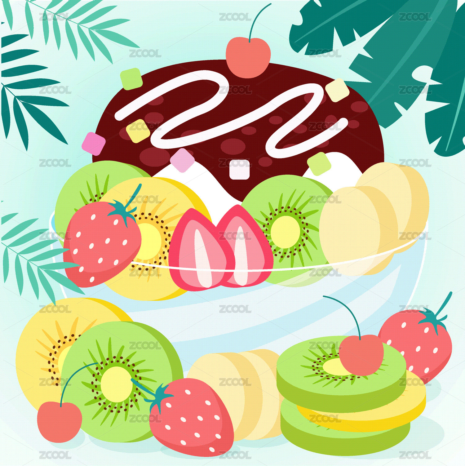 卡通夏季水果拼盘冰淇淋草莓猕猴桃香蕉插画