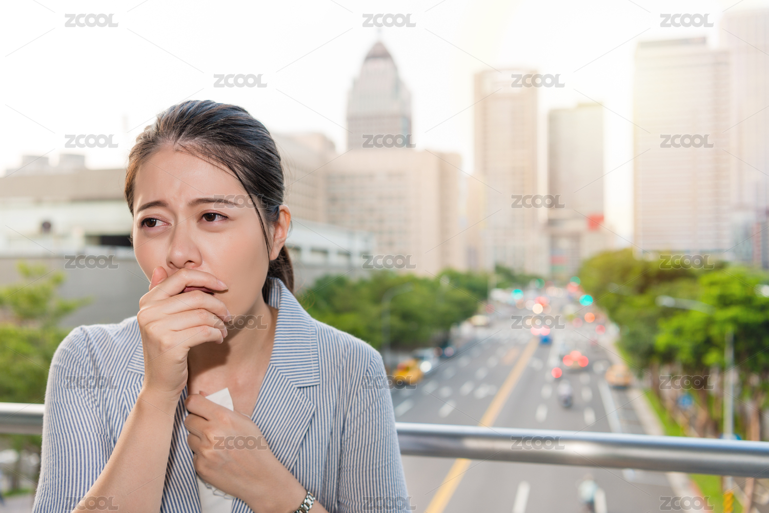 漂亮的office lady感觉头痛从高峰时段时间城衰的空气污染痛苦。