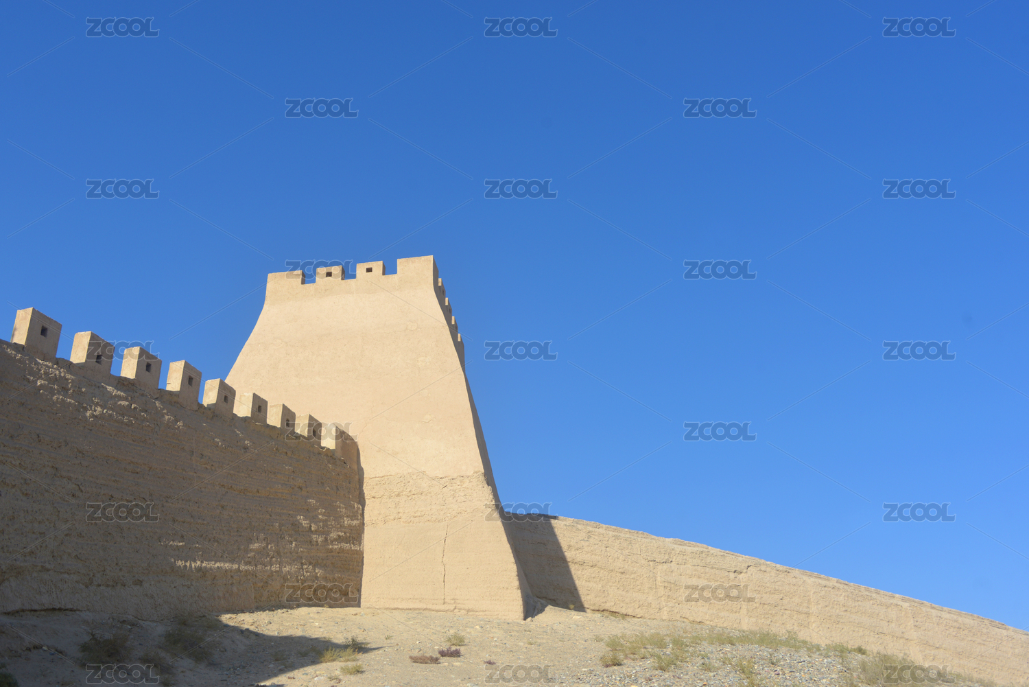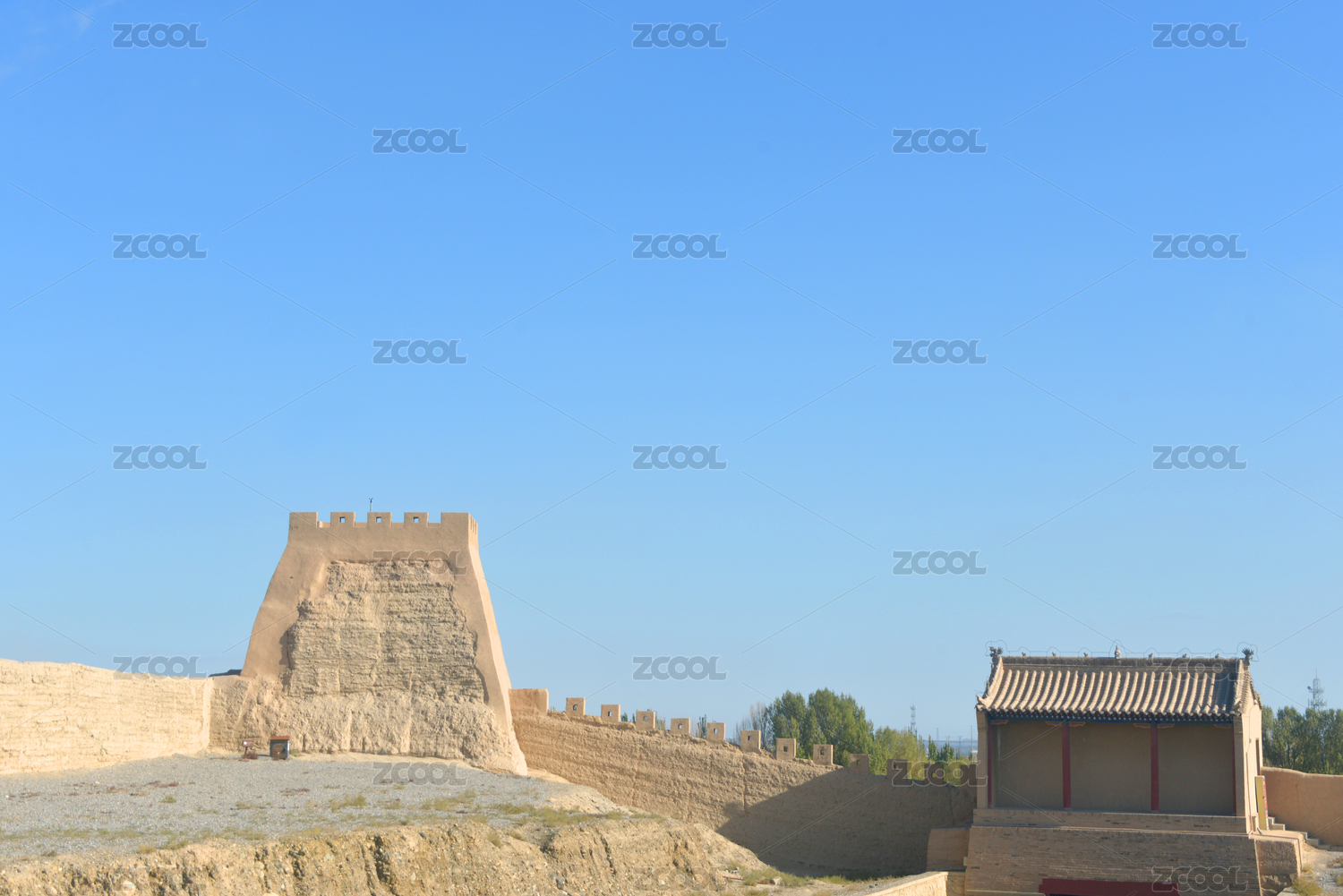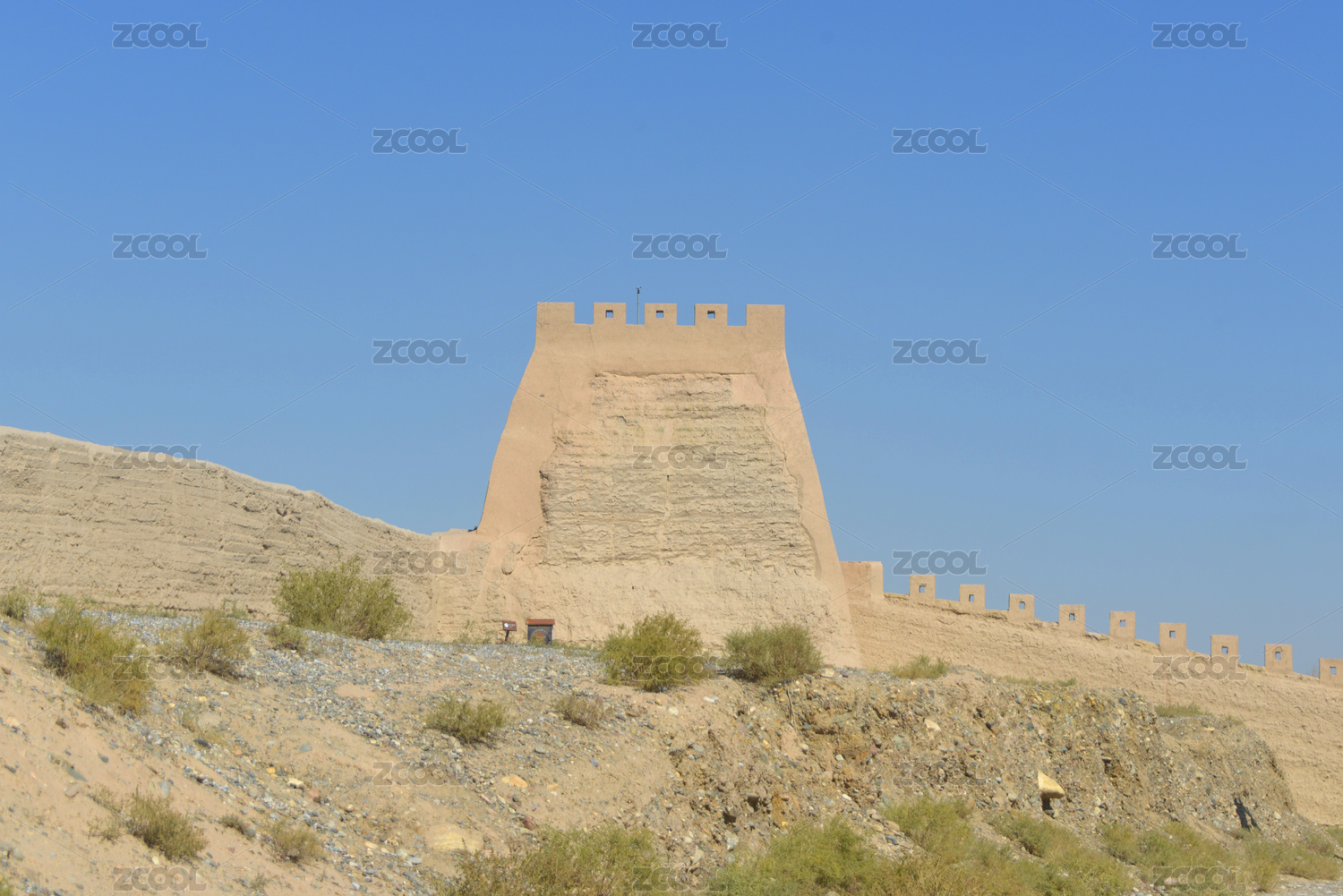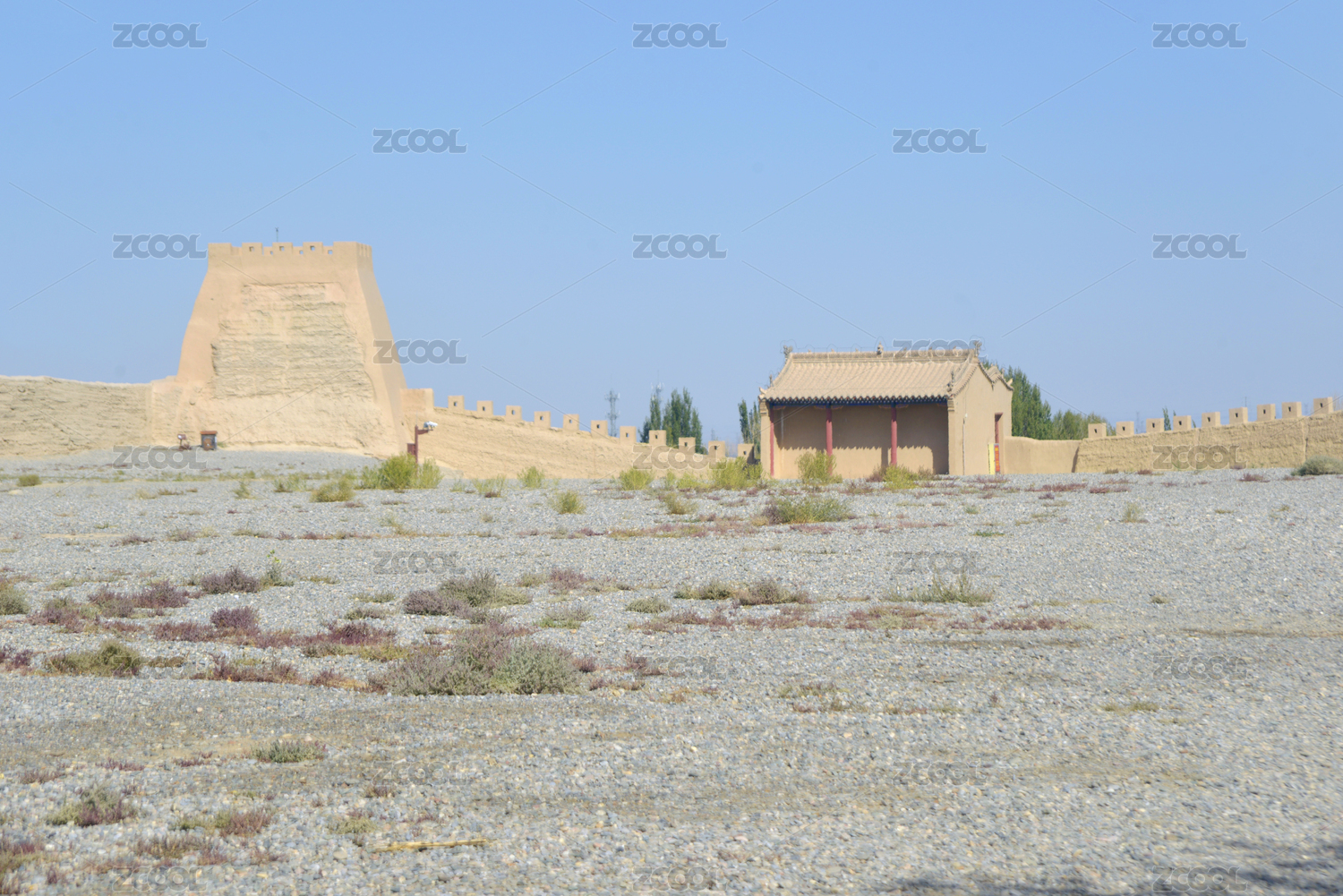 甘肃嘉峪关边墙东闸门城楼及风滚草