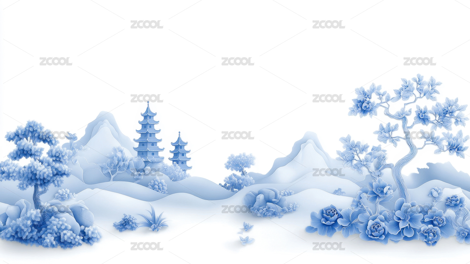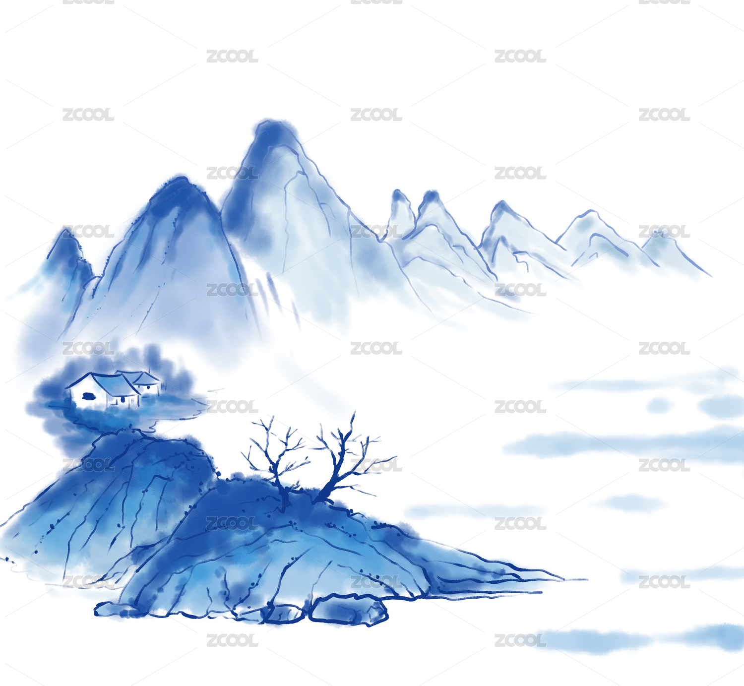 青花瓷风格的山水画