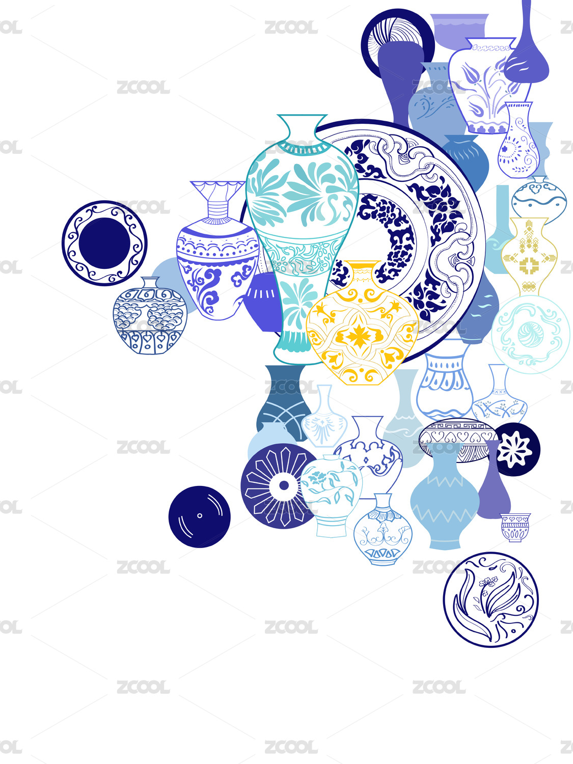 散落放置的各式青花瓷瓶和青花瓷盘