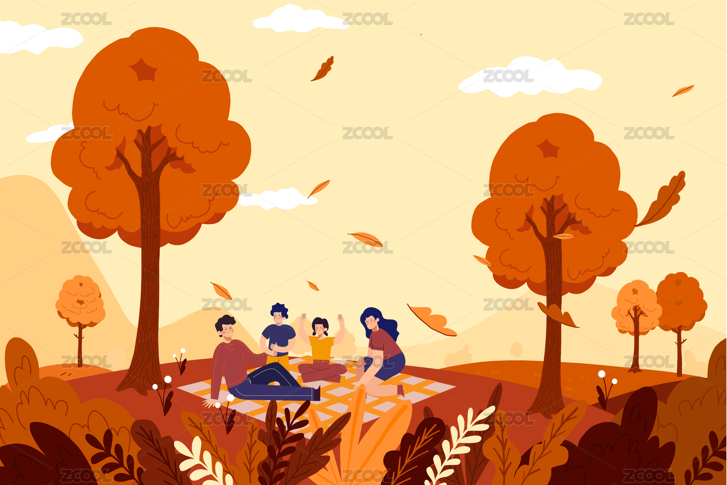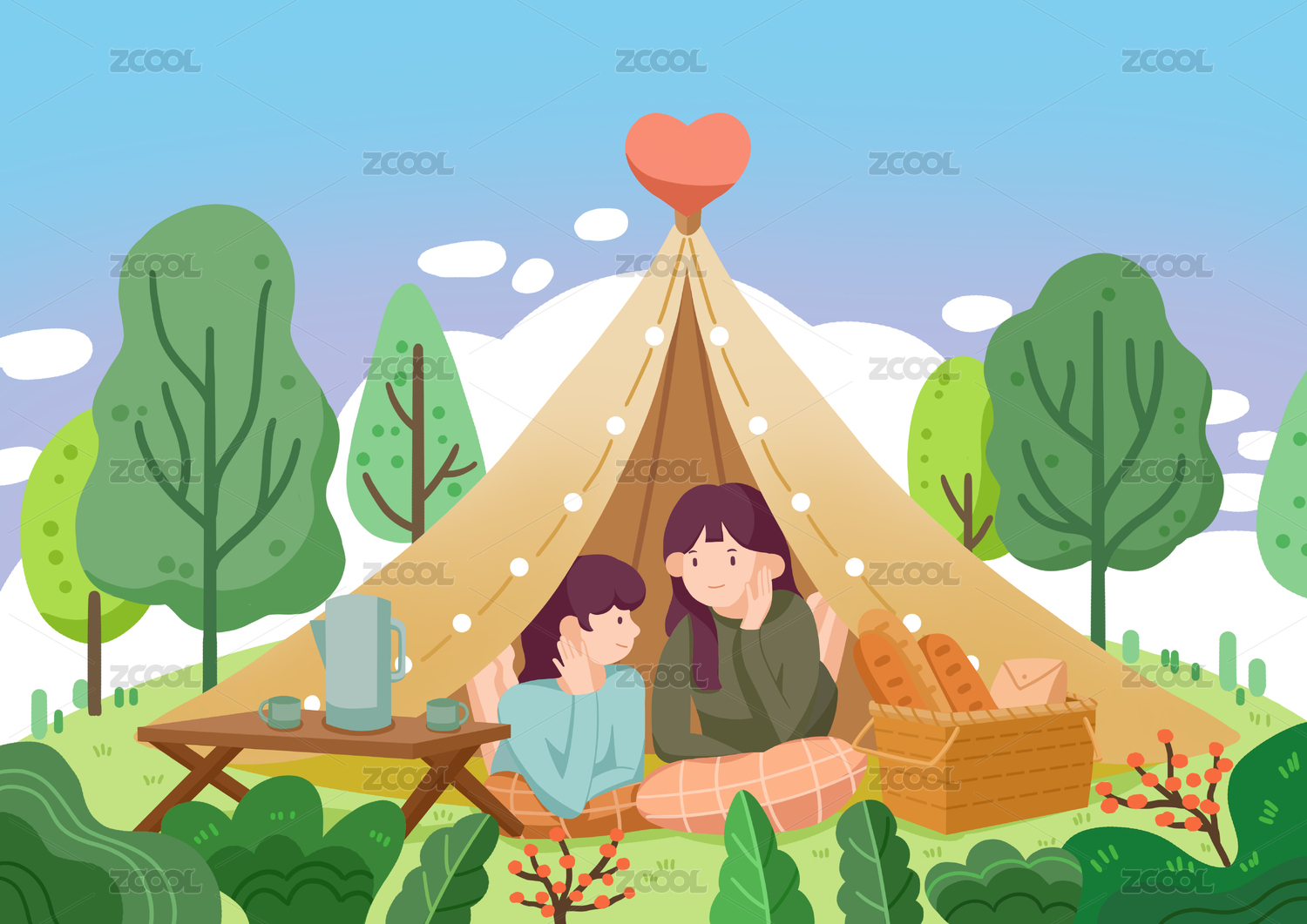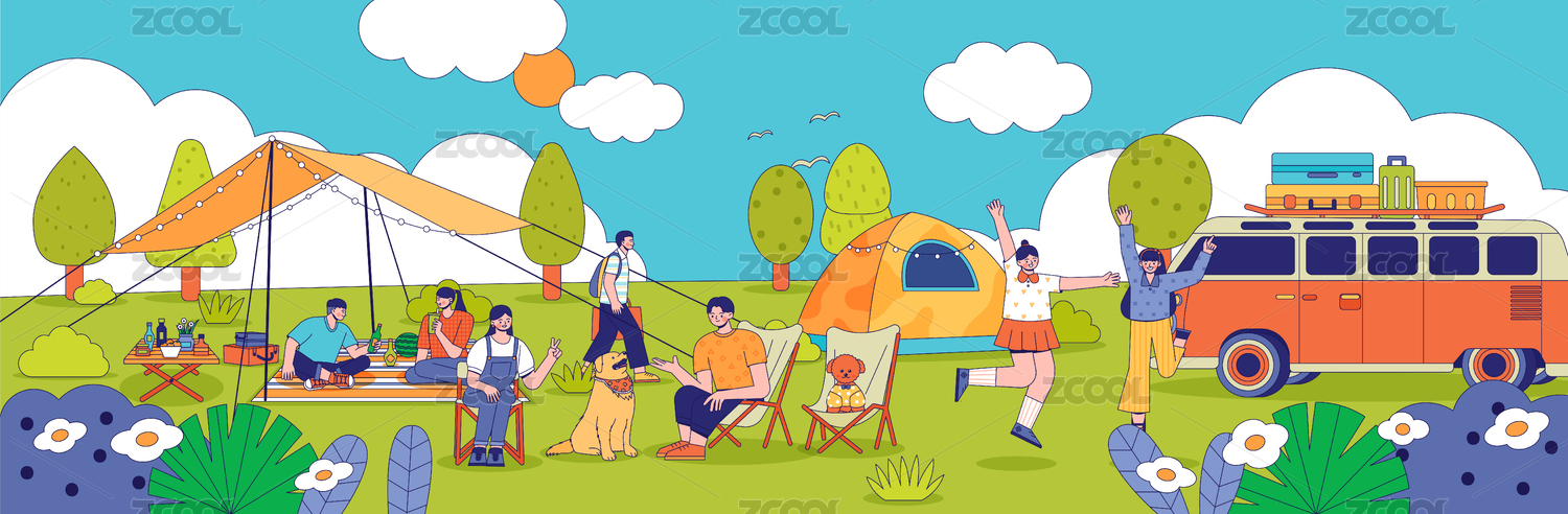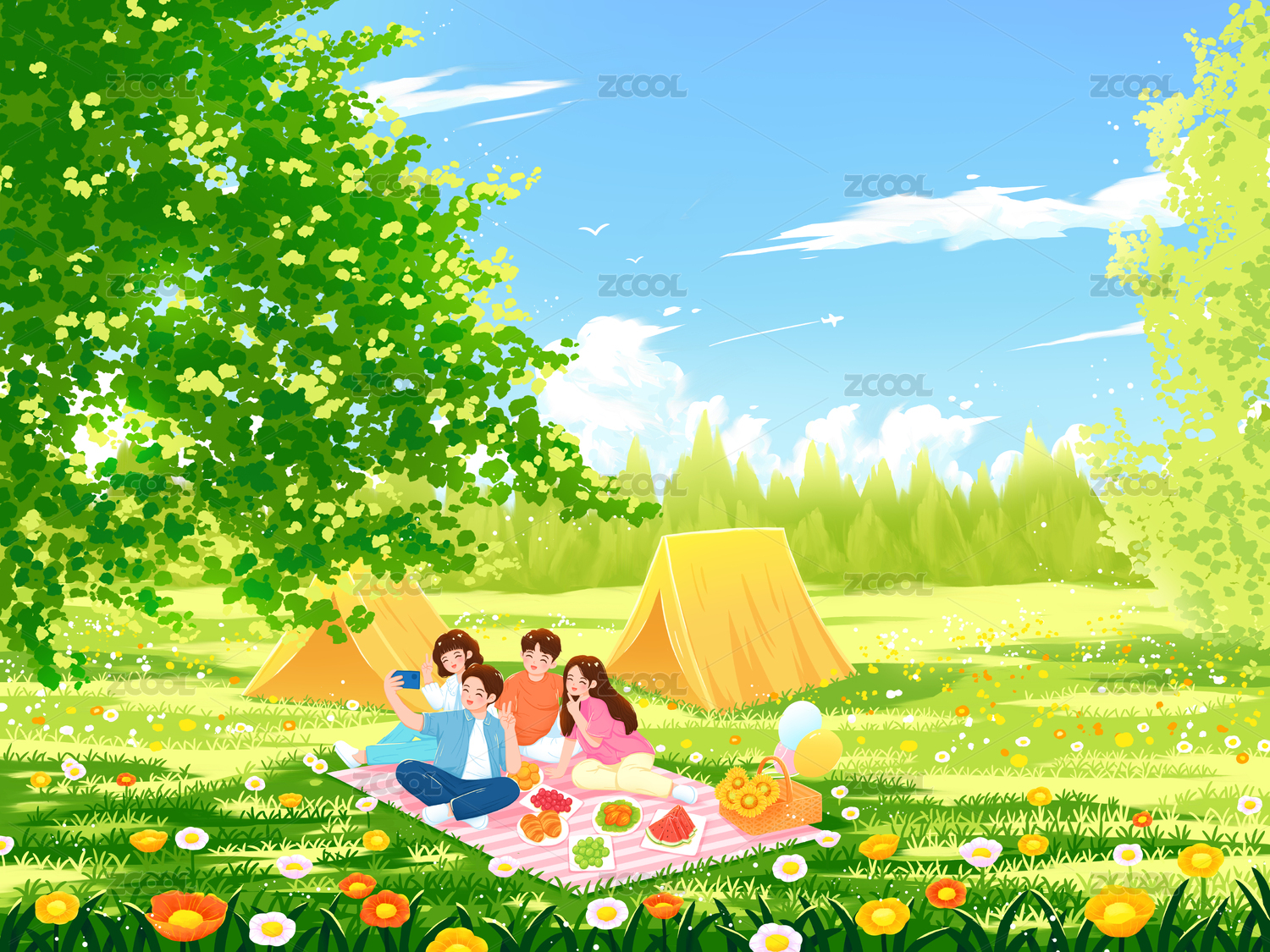 夏天假期朋友一起在树下露营野餐风景插画
