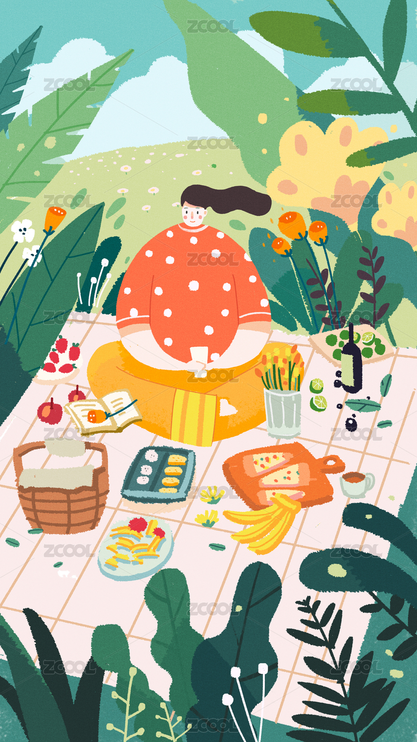 春季女孩旅游踏青在草地野餐矢量插画