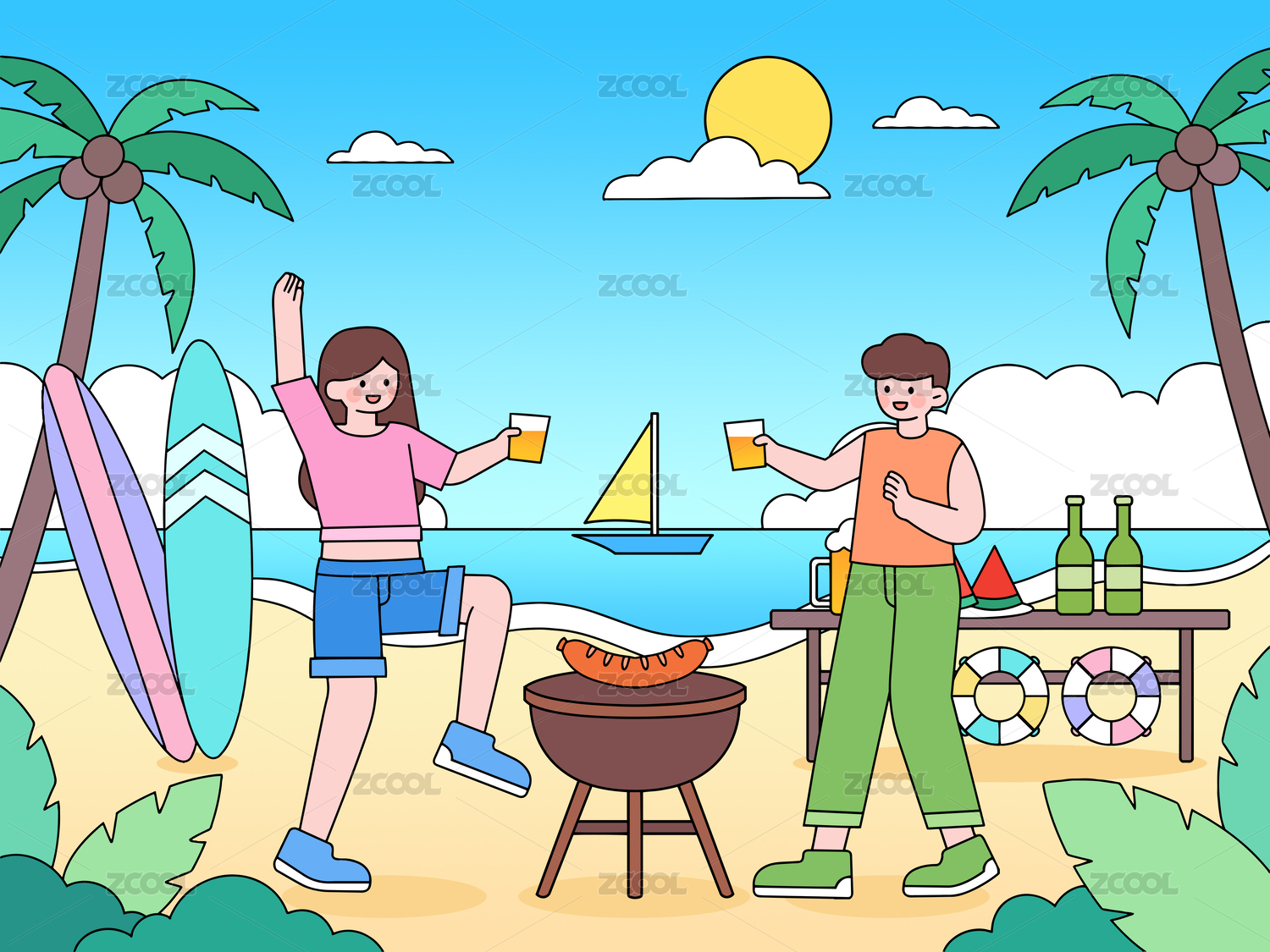 扁平风夏天海边烧烤野餐露营娱乐的年轻人