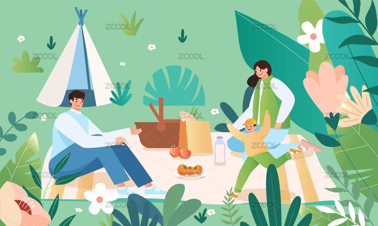 一家人春天野餐露营插画