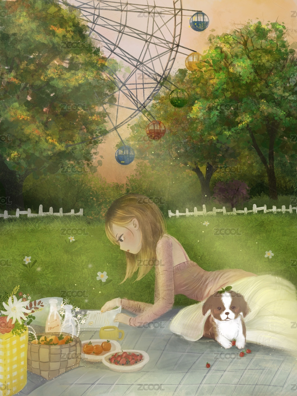 黄昏的公园里小狗陪女孩在野餐垫上休息看书
