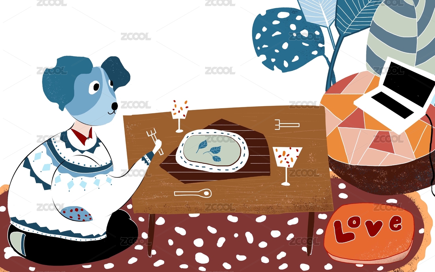 创意插画原创插画撸猫单身生活日常休闲夏天绿植蓝色手绘插画
