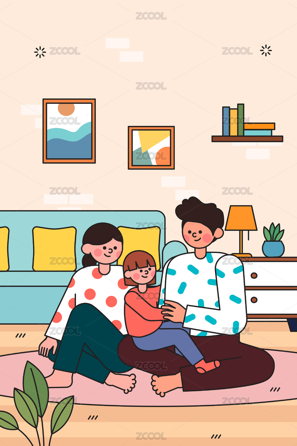 一家三口生活日常矢量插画