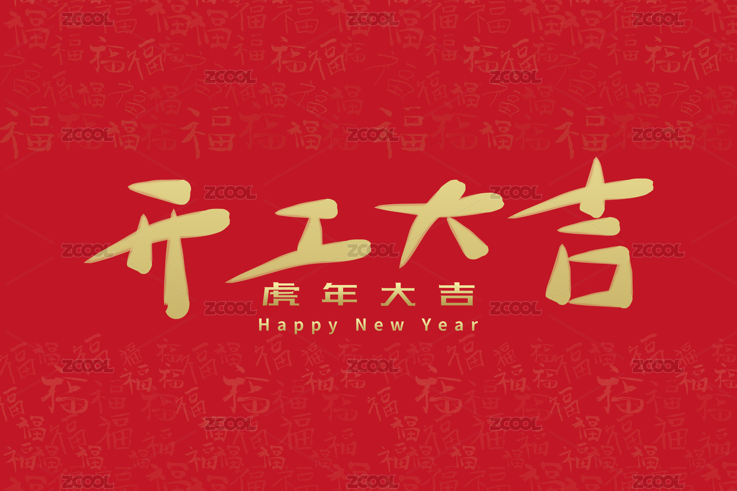 红底福字纹理金色开工大吉手写毛笔字体海报