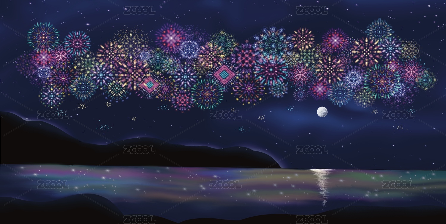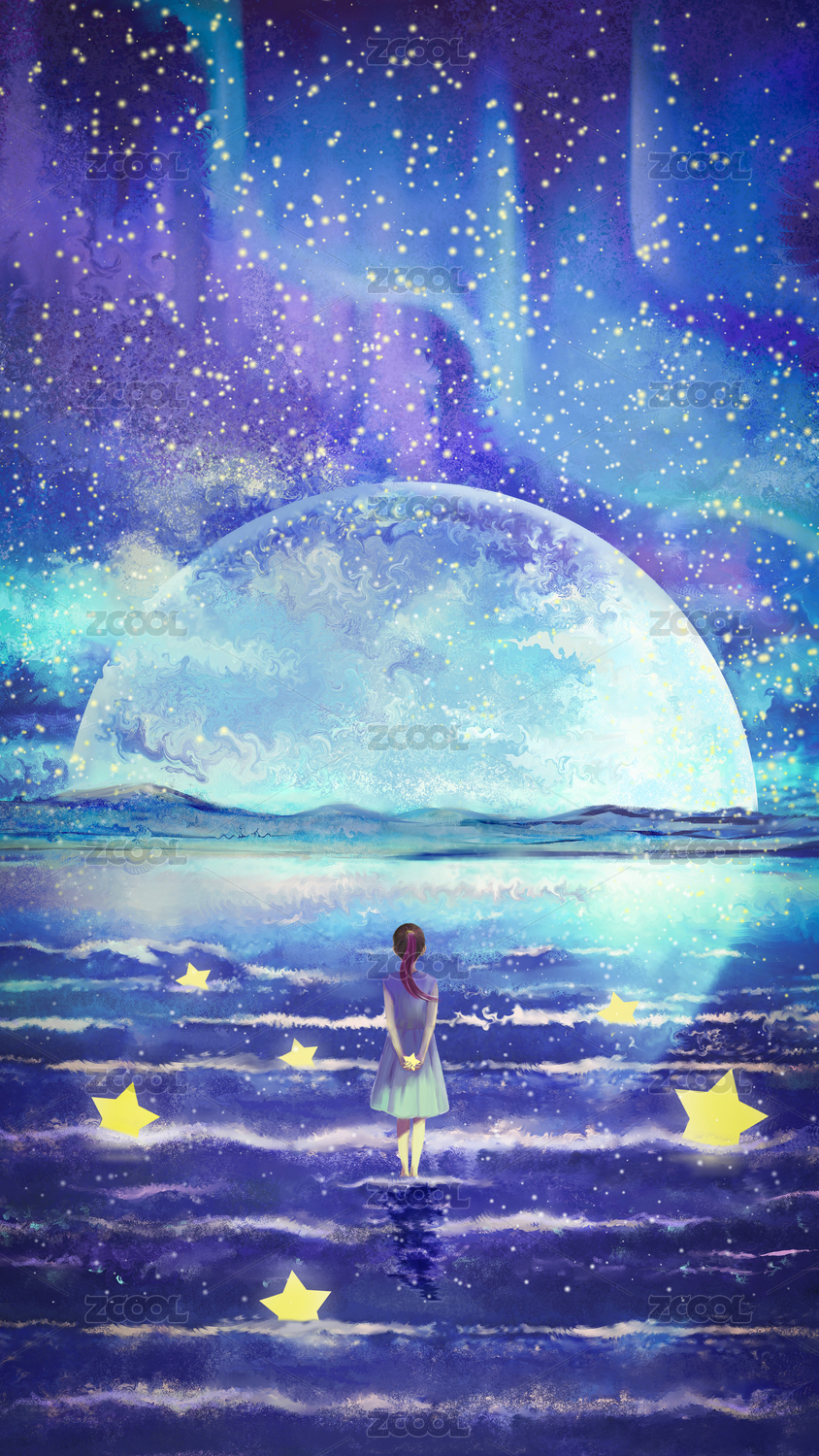 少女面朝洒满繁星的大海捡星星插画壁纸
