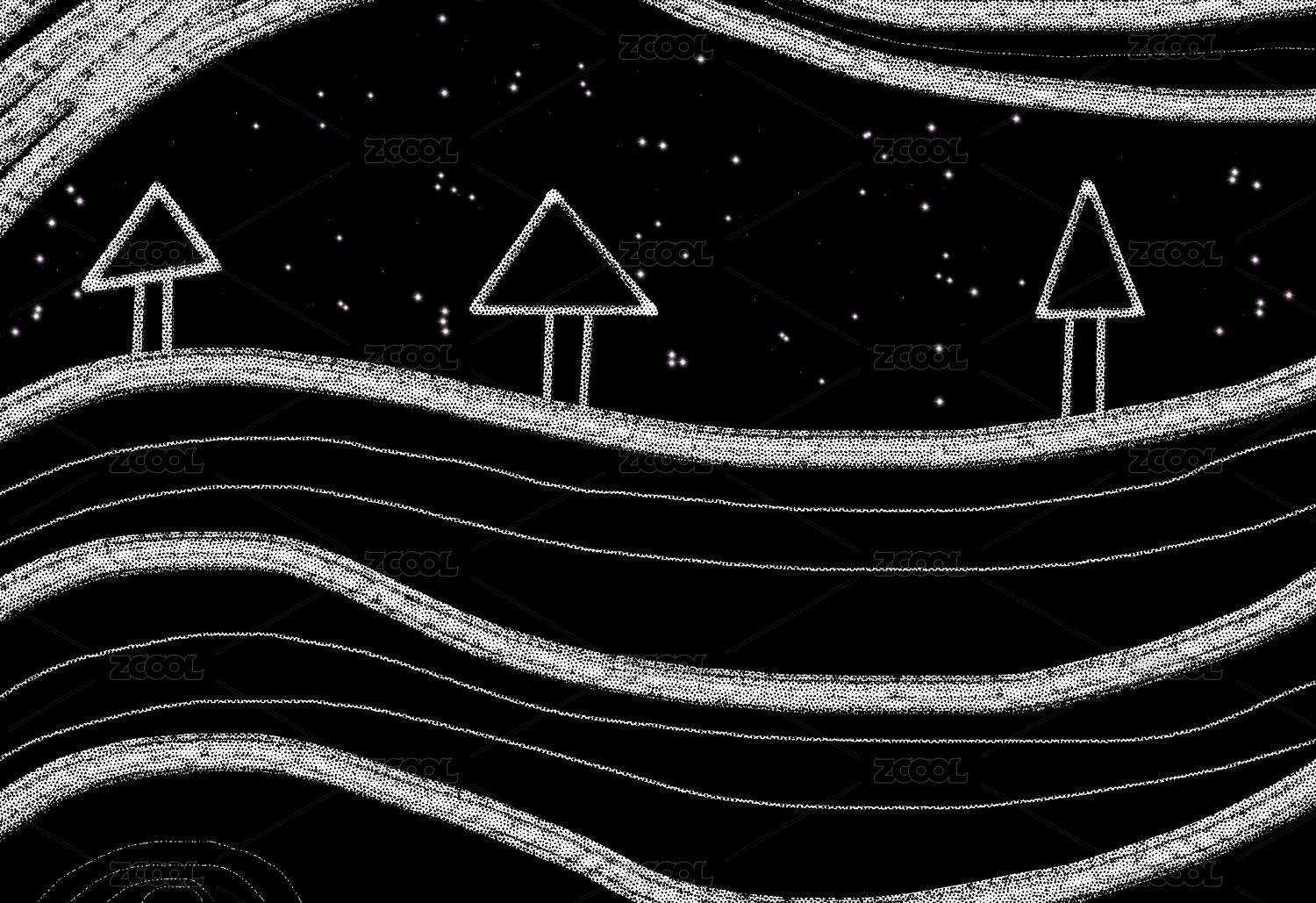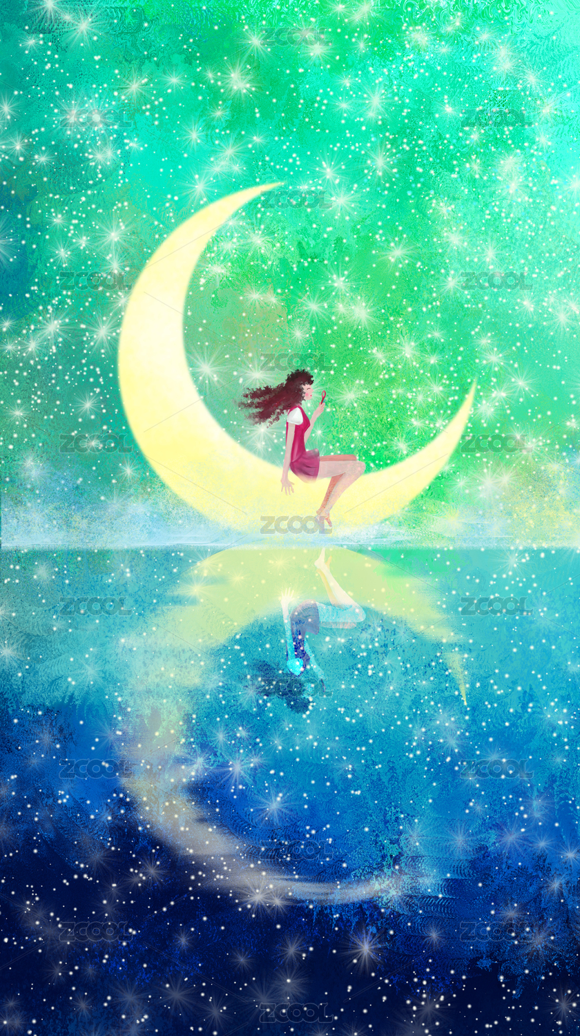 满天繁星的夜空背景下穿晚装的少女在都市灯光前握着布满星星的丝绢竖构图插画