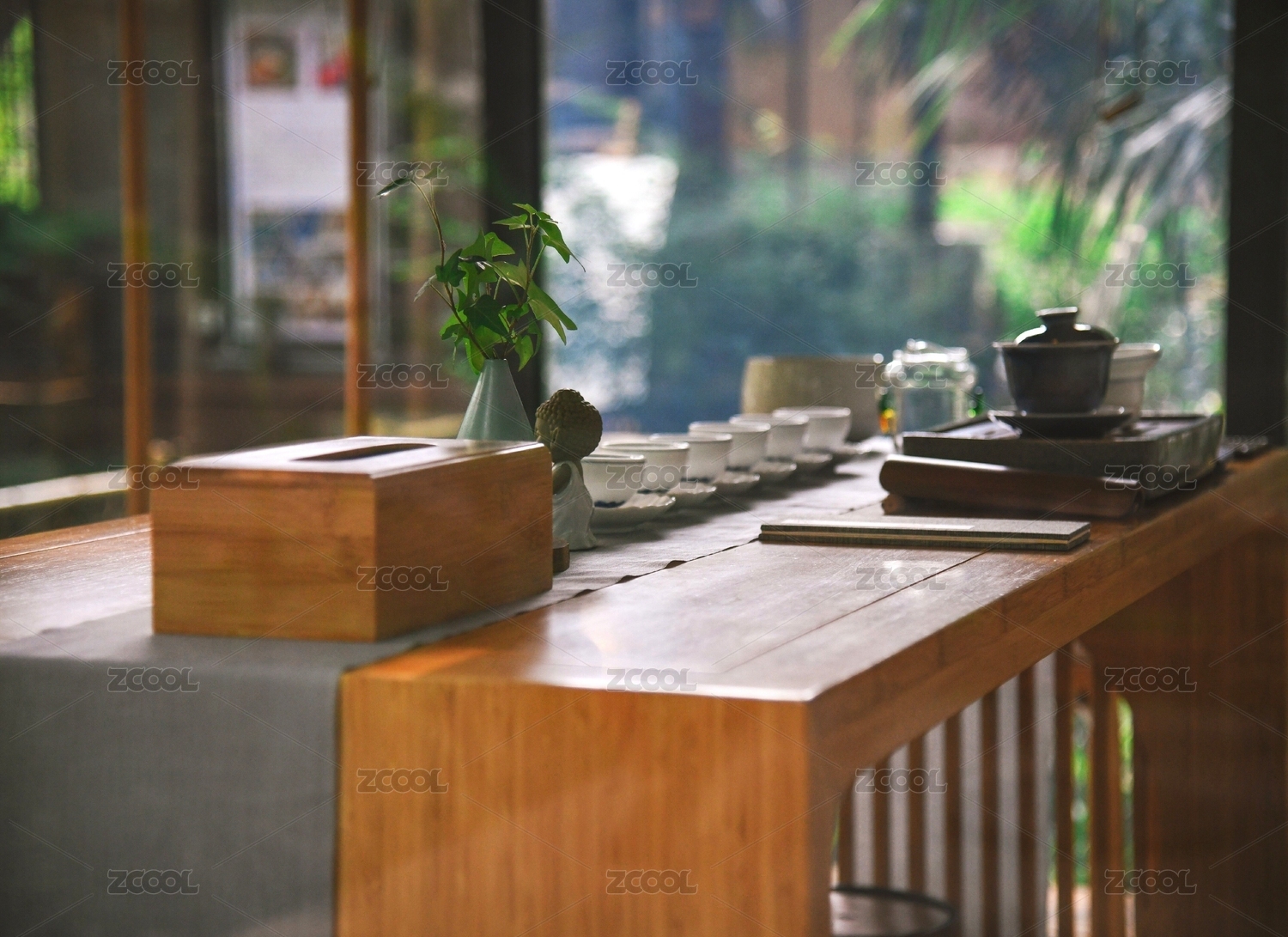 百叶窗前的沙发和摆放有白掌绿植和荞麦茶的茶几