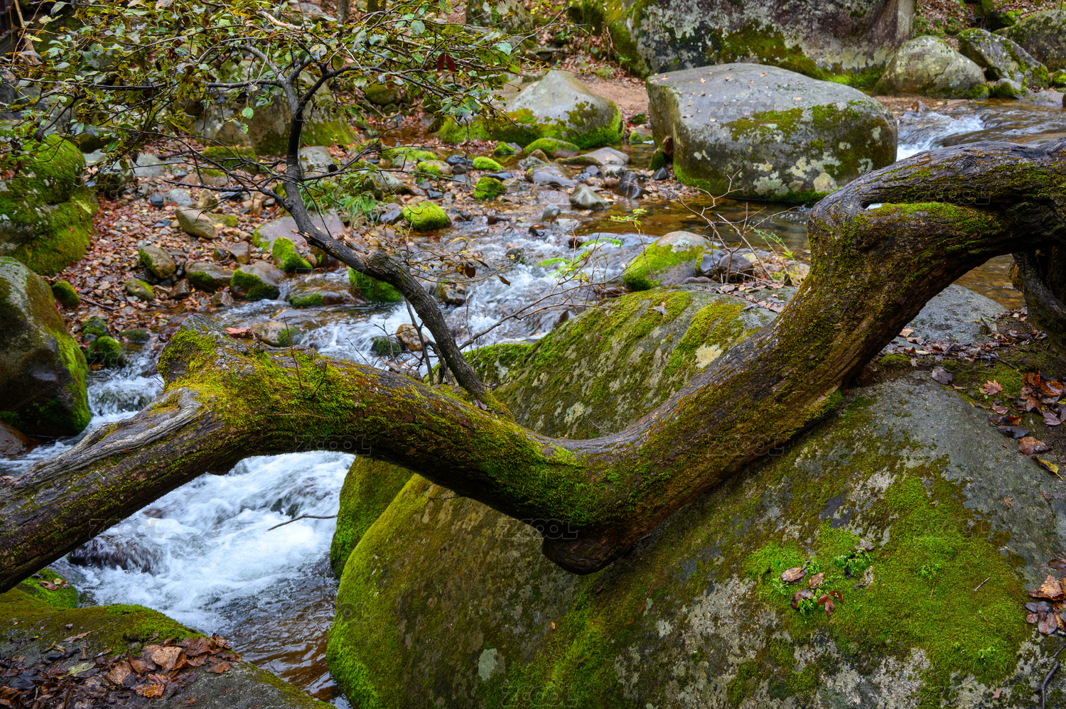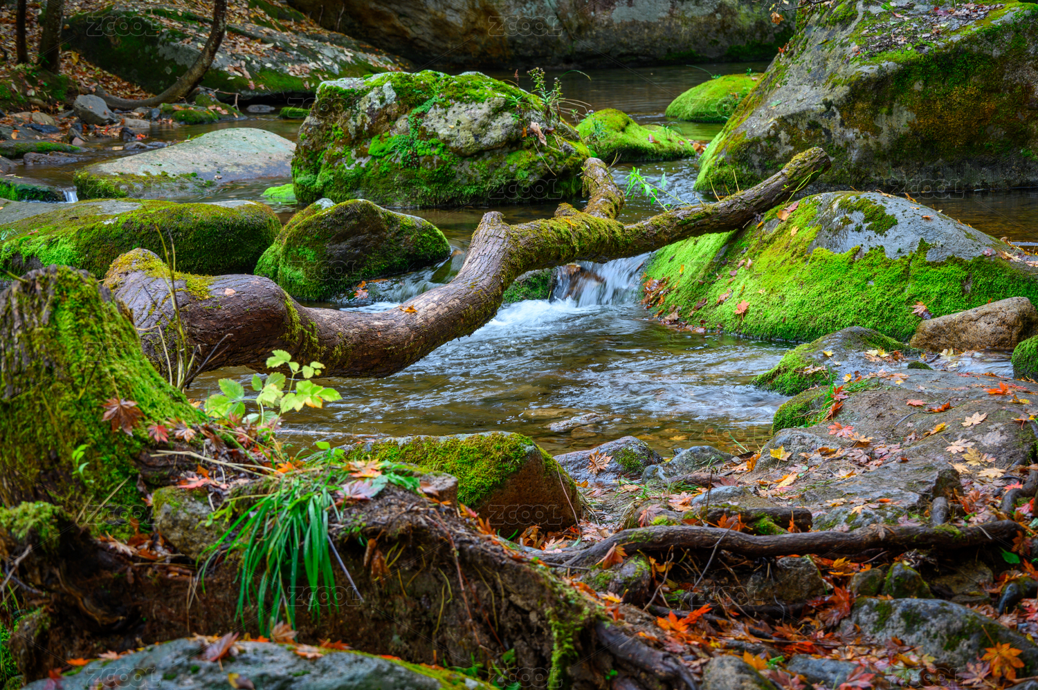 沈阳本溪老边沟,枯木苔藓岩石流水落叶景观