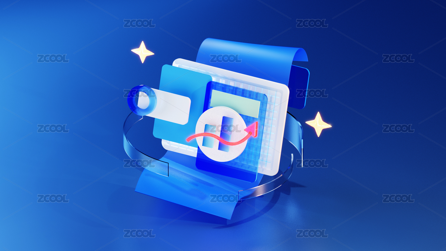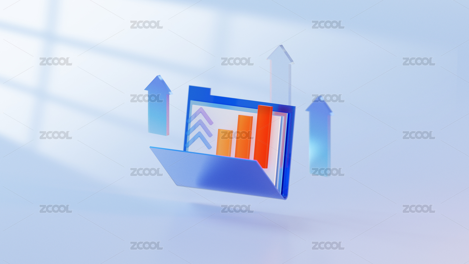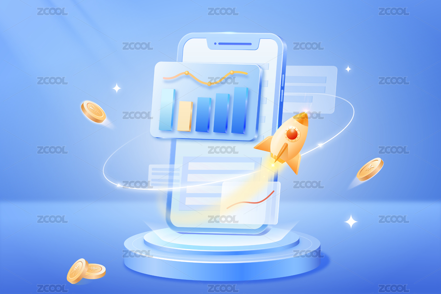 放大镜查看业绩账单柱状图和饼图上升走势图