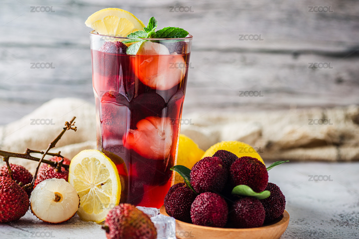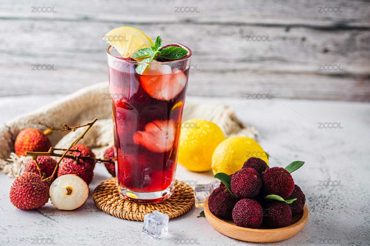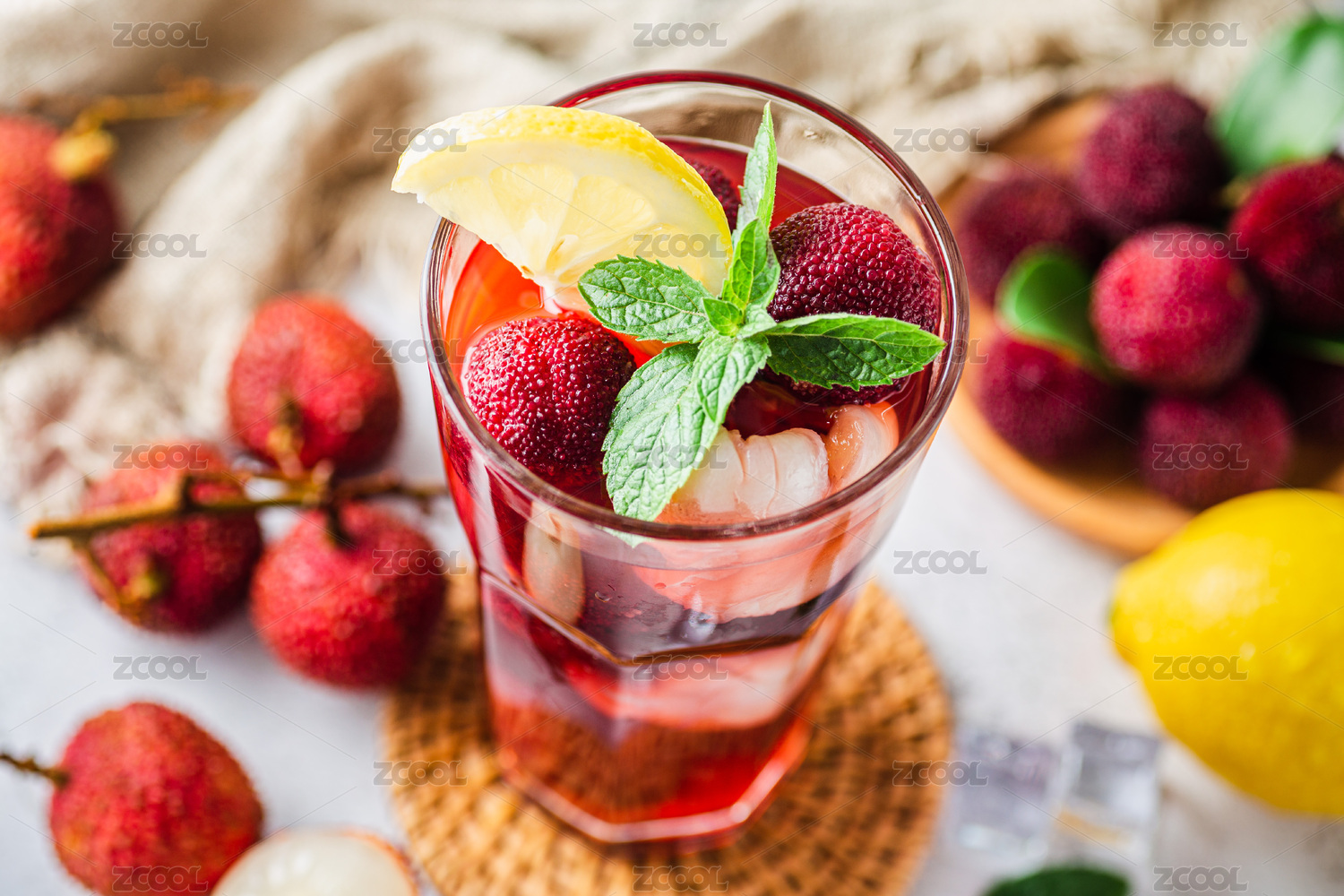 白色背景上塑料杯里的荔枝杨梅冷饮