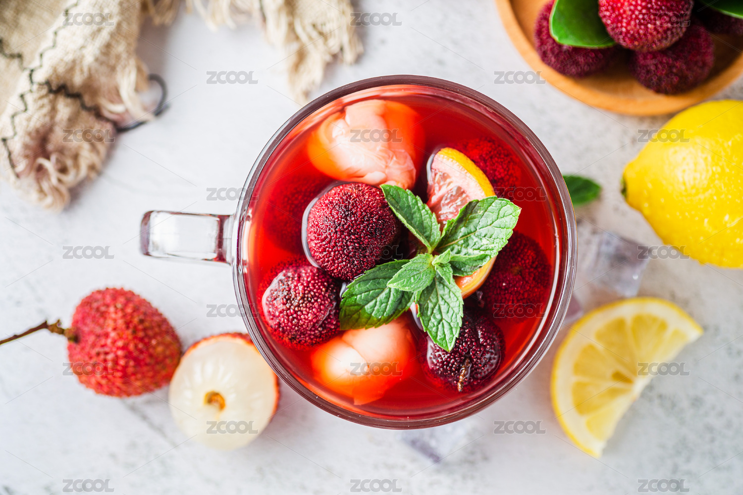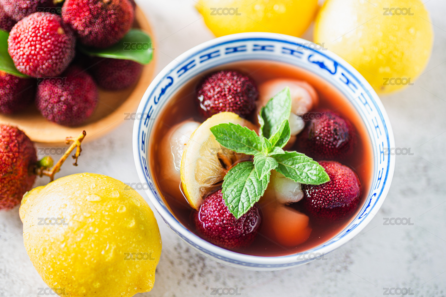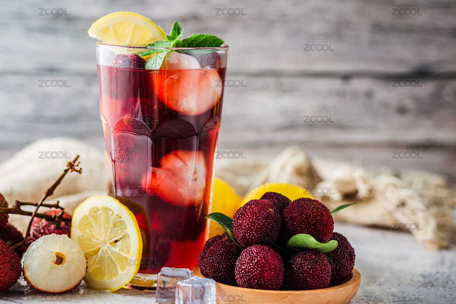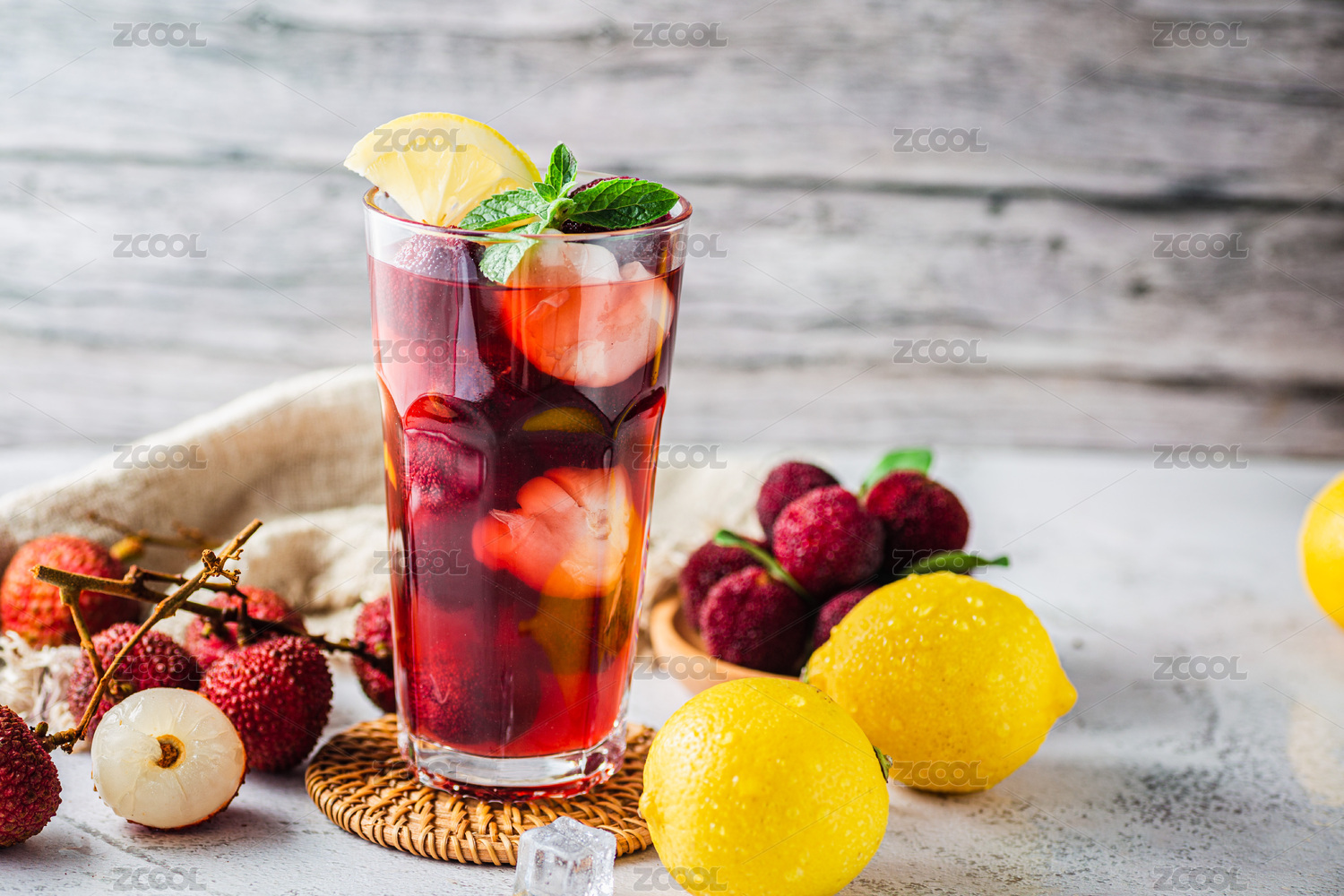 白色背景上塑料杯里的荔枝杨梅冷饮