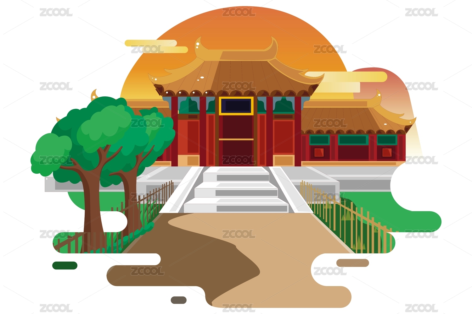 新水墨插画人物、建筑