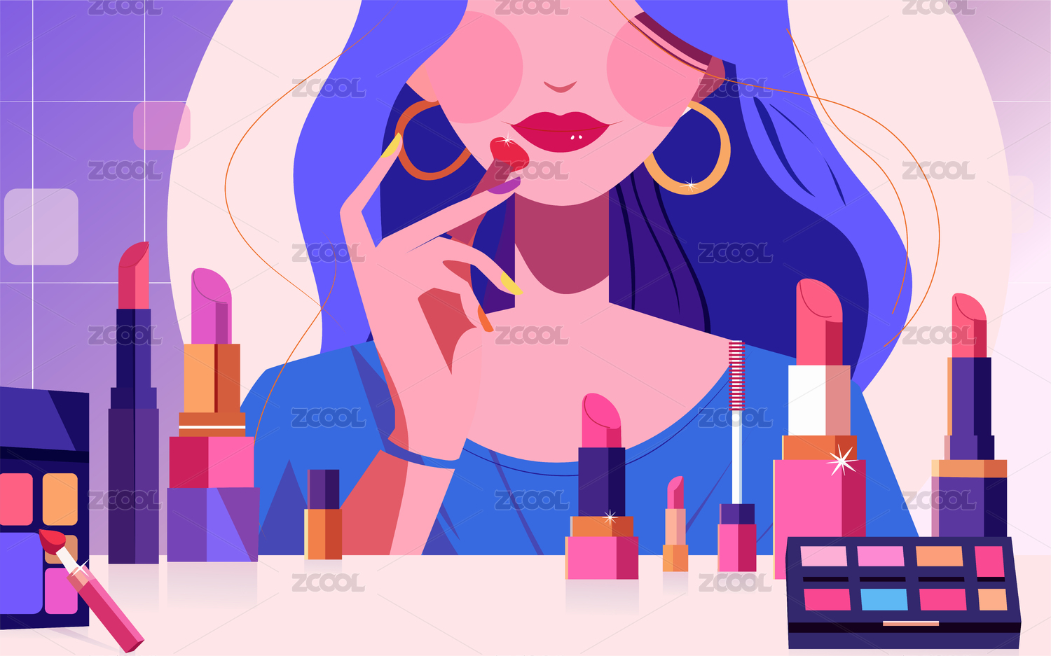 直播间美女护肤化妆品直播带货电商促销插画