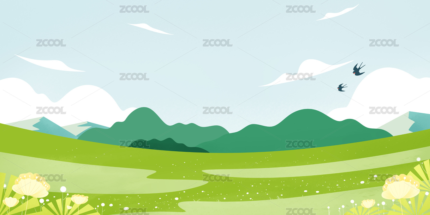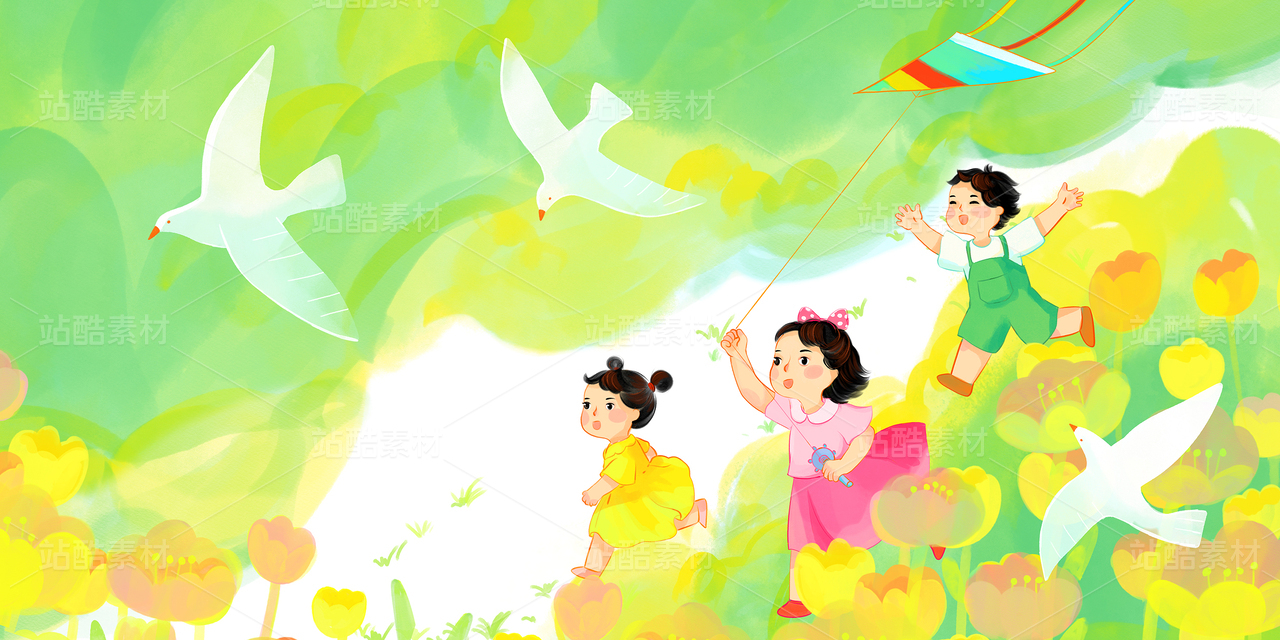 六一儿童节花丛草地男孩女孩放风筝鸽子插画
