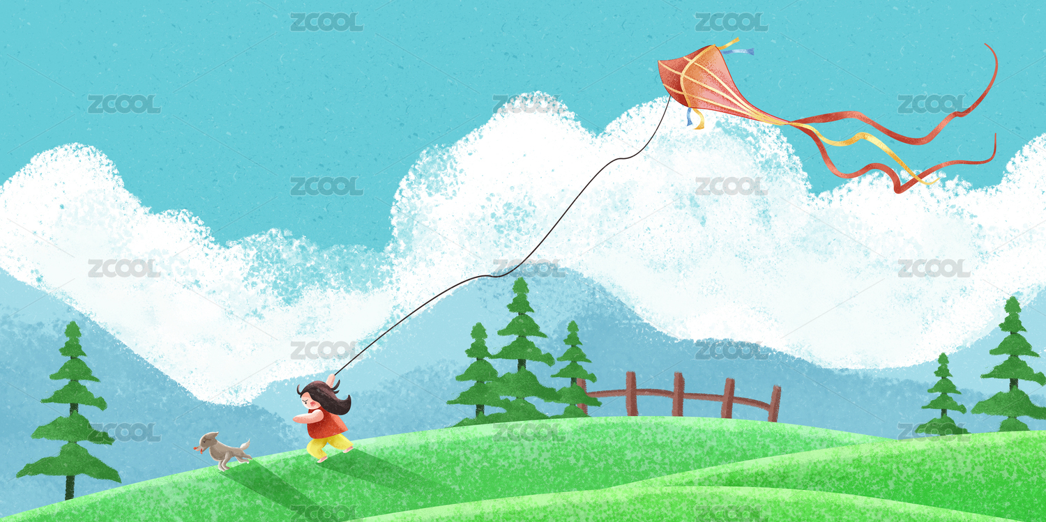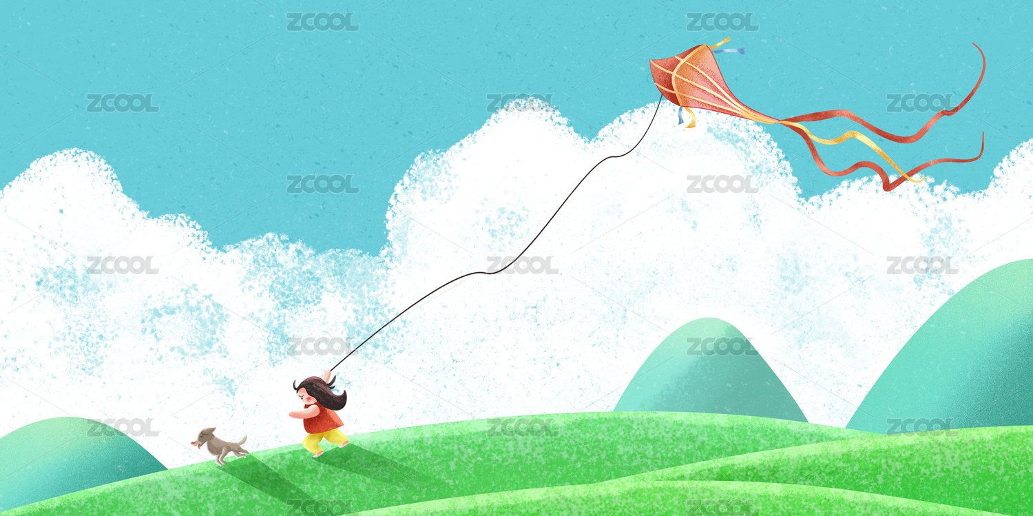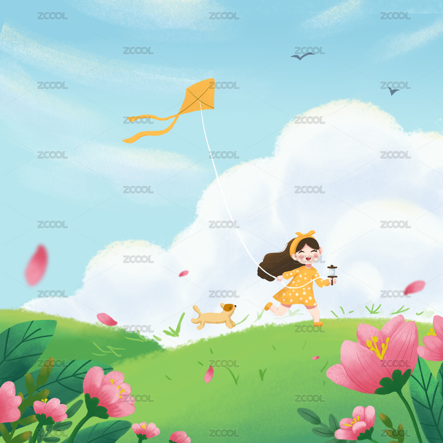 手绘和小狗奔跑在春天里小女孩放风筝插画