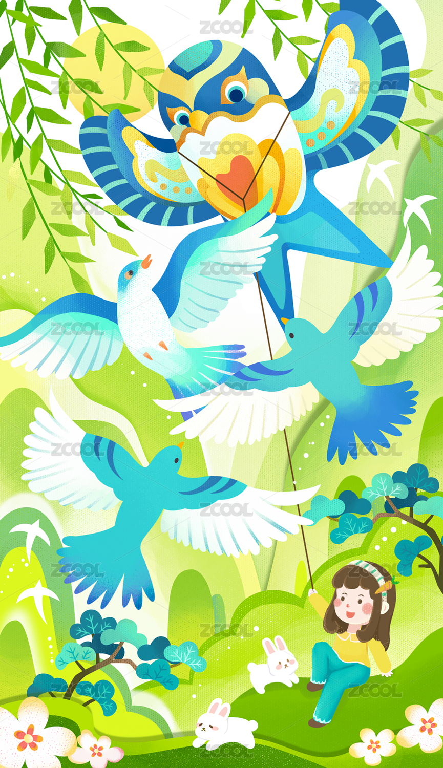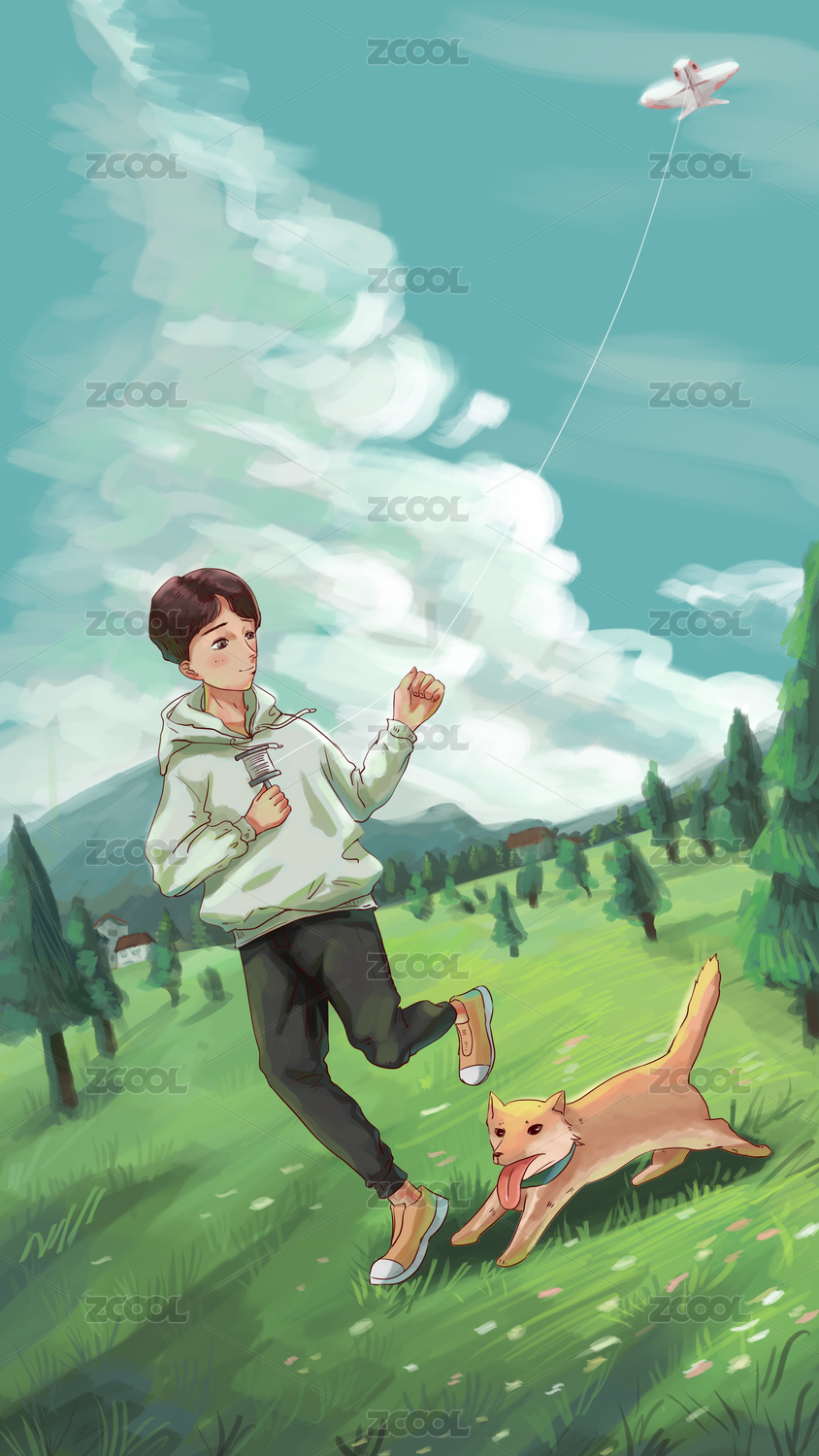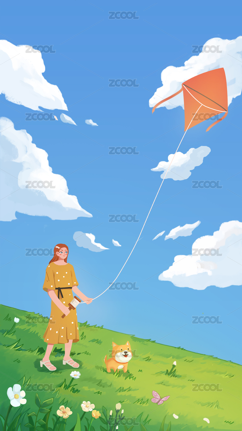 手绘和小狗奔跑在春天里小女孩放风筝插画