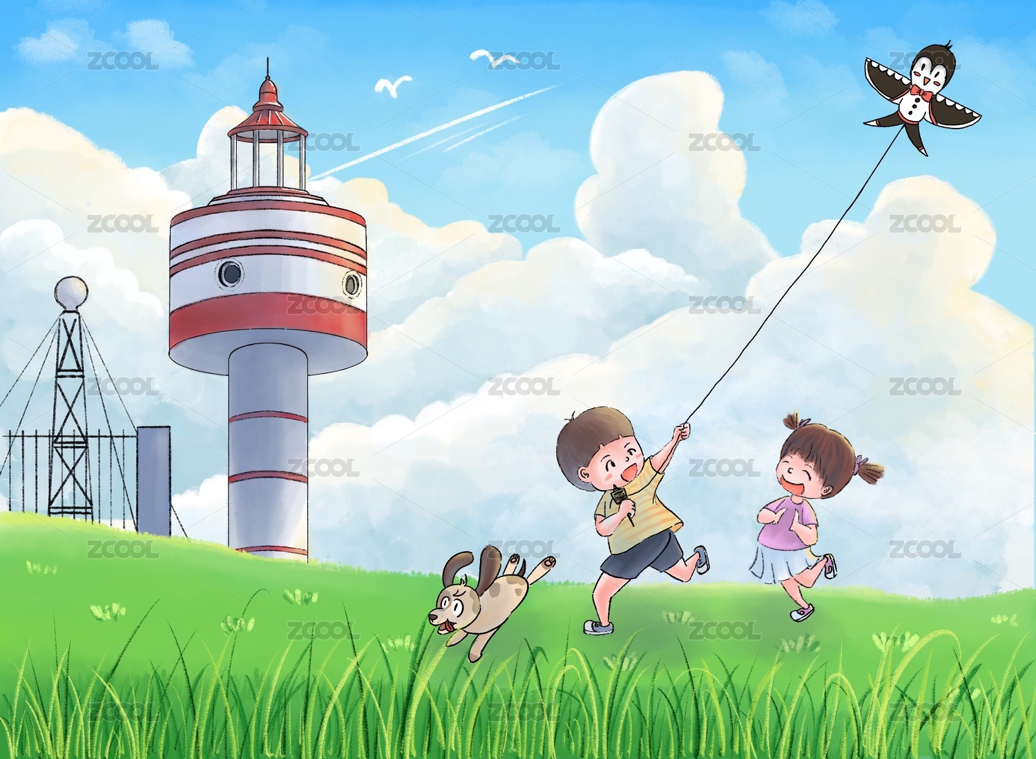 两个小朋友带着一只小狗在灯塔旁边放风筝