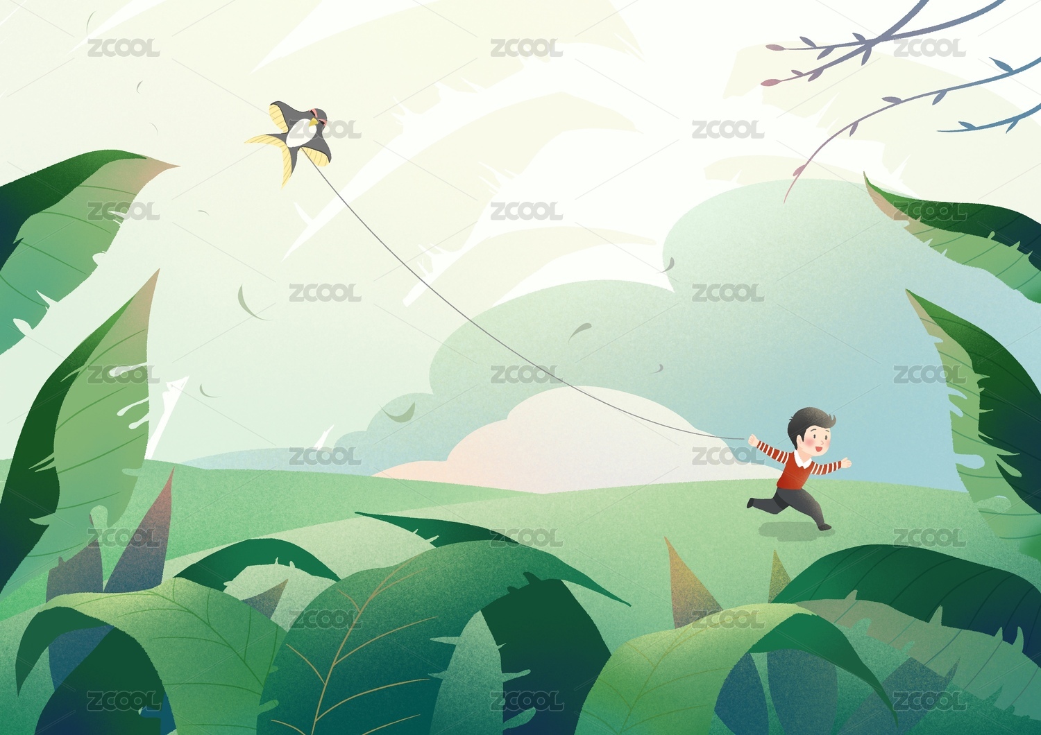 卡通风小男孩户外放风筝童趣小朋友儿童插画